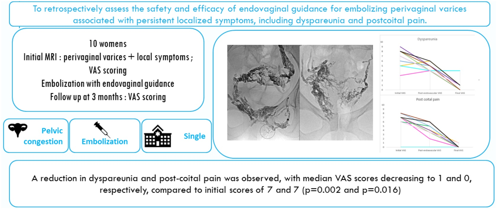 The limitations of this study include the small number of patients treated, as this is an emerging technique. Most patients had undergone endovascular embolization that failed to catheterize the perivaginal varices. This subgroup represents a small proportion of patients treated for this condition, but early publication is warranted given the absence of prior research and the need to inform the scientific community about a potential therapeutic option. It may, therefore, be relevant to directly select patients who are likely to benefit from this technique, in order to perform both endovascular and endovaginal embolization during the same procedure, as was performed for one patient in the cohort. Finally, the 3-month follow-up period is likely insufficient to fully assess the risk of recurrence.