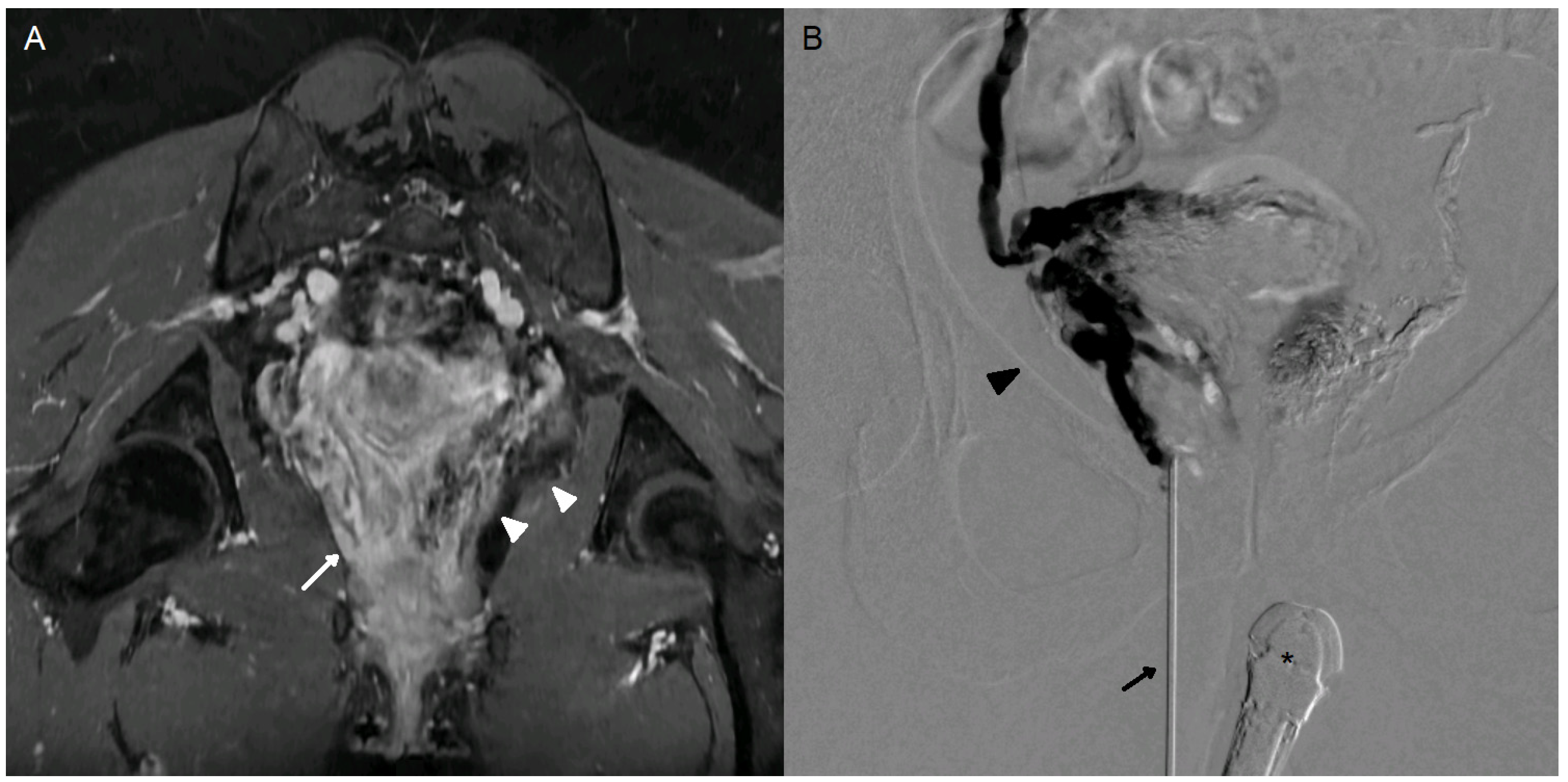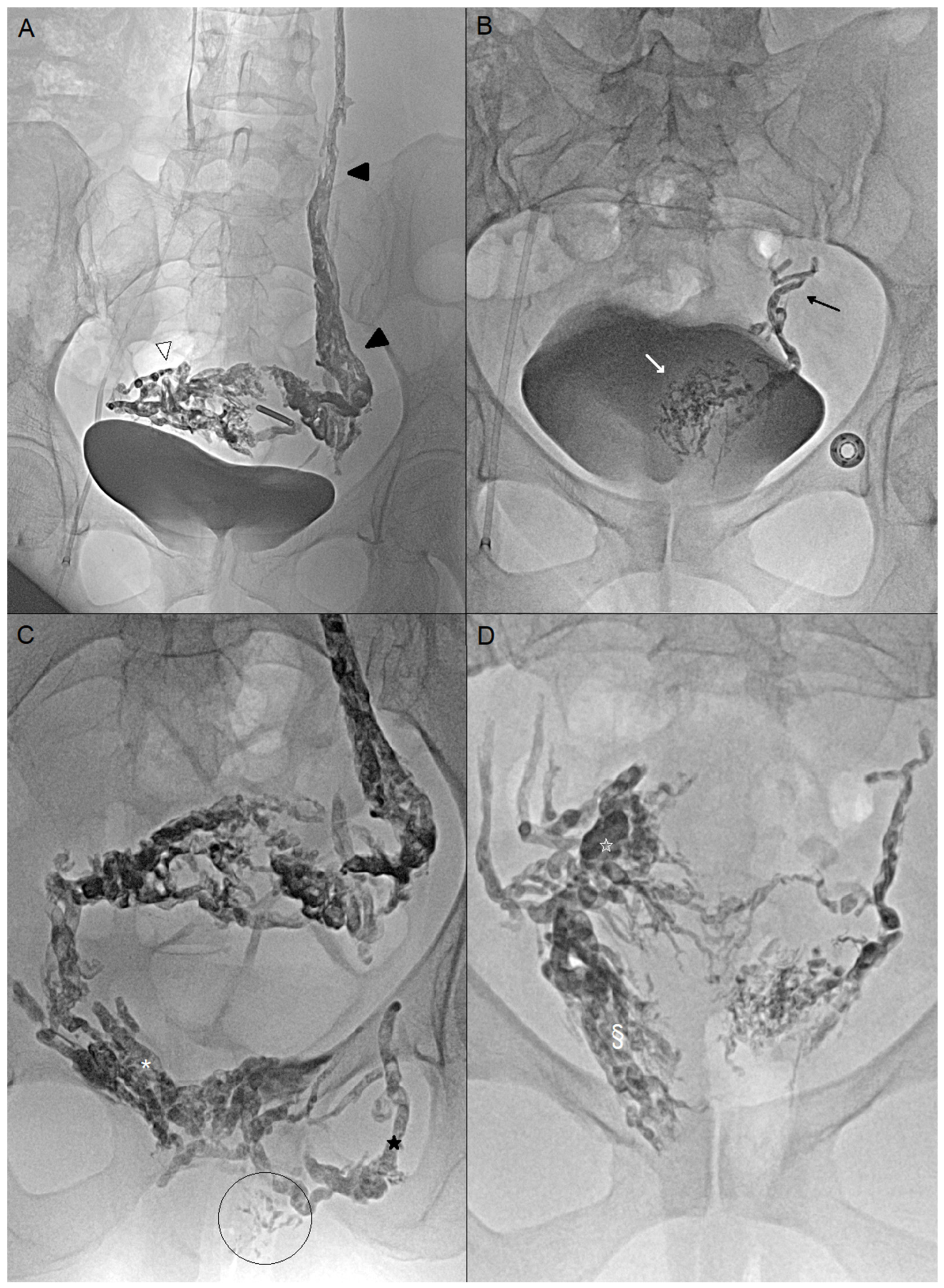 - Pennec, V.L.; Douane, F.; Brun, J.L.; Thouveny, F.; Martinelli, T.; Bravetti, M.; Mastier, C.; Le Bras, Y.; Rogopoulos, A.; Barral, P.A.; et al. Endovascular management of pelvic congestion syndrome: An expert consensus statement from the French Society of Cardiovascular Imaging (SFICV), Interventional Radiology Federation (FRI), College of French Radiology Teachers (CERF), and French Society of Women’s Imaging (SIFEM). Diagn. Interv. Imaging 2025, 106, 356–366. [Google Scholar] [CrossRef] [PubMed]