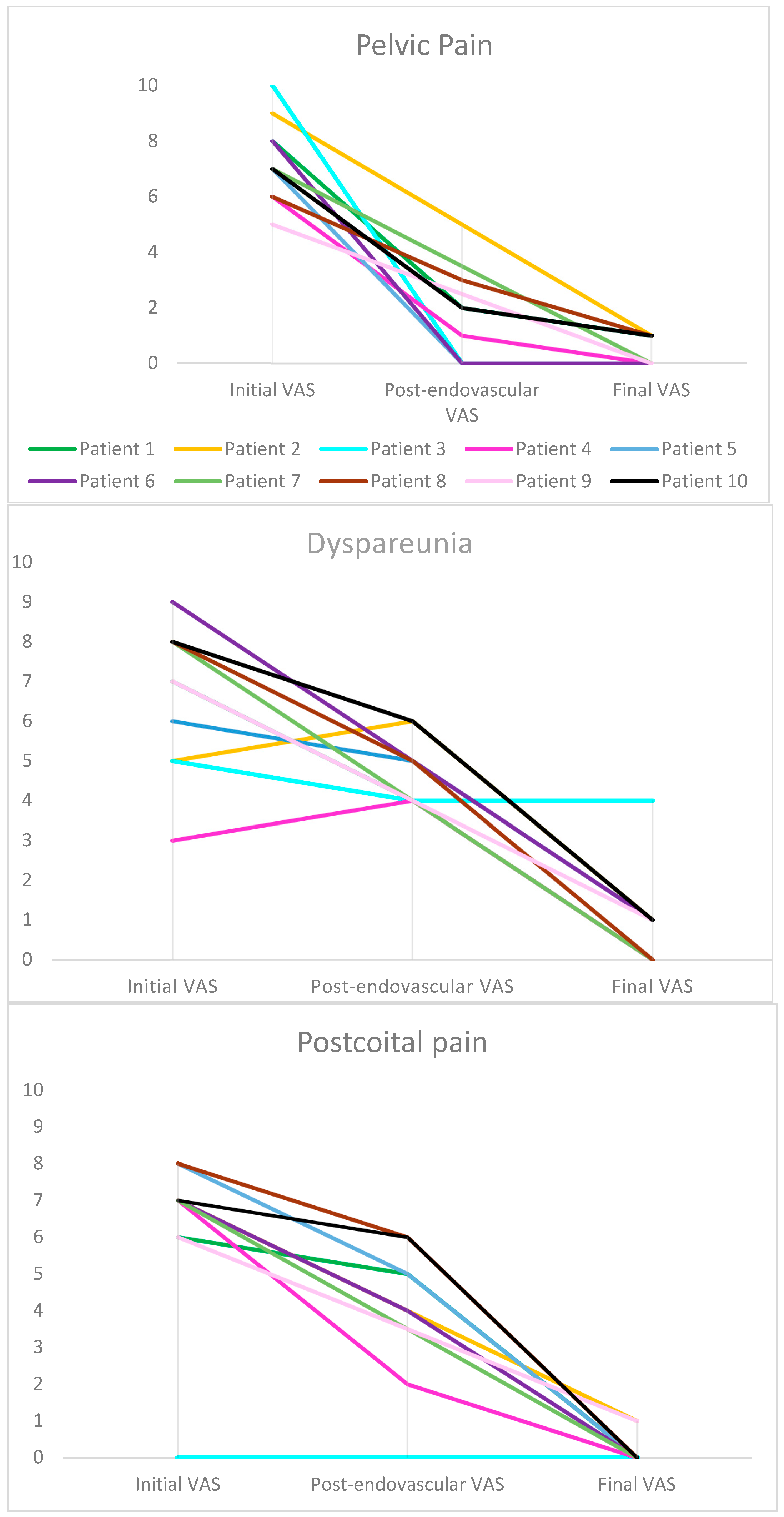 - Laborda, A.; Medrano, J.; de Blas, I.; Urtiaga, I.; Carnevale, F.C.; de Gregorio, M.A. Endovascular treatment of pelvic congestion syndrome: Visual analog scale (VAS) long-term follow-up clinical evaluation in 202 patients. Cardiovasc. Interv. Radiol. 2013, 36, 1006–1014. [Google Scholar] [CrossRef] [PubMed]