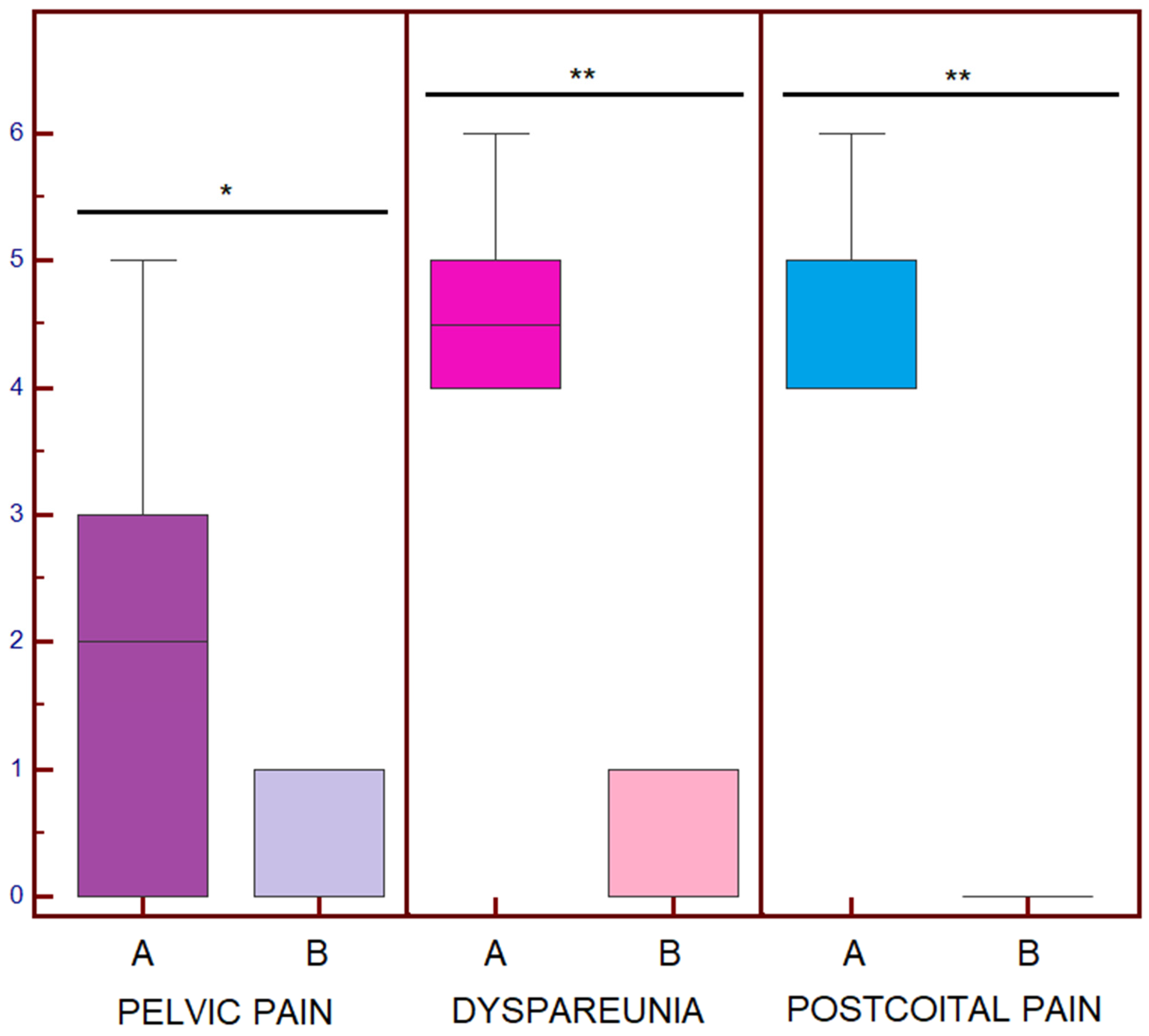 - Senechal, Q.; Echegut, P.; Bravetti, M.; Florin, M.; Jarboui, L.; Bouaboua, M.; Teriitehau, C.; Feignoux, J.; Legou, F.; Pessis, E. Endovascular Treatment of Pelvic Congestion Syndrome: Visual Analog Scale Follow-Up. Front. Cardiovasc. Med. 2021, 8, 751178. [Google Scholar] [CrossRef] [PubMed]