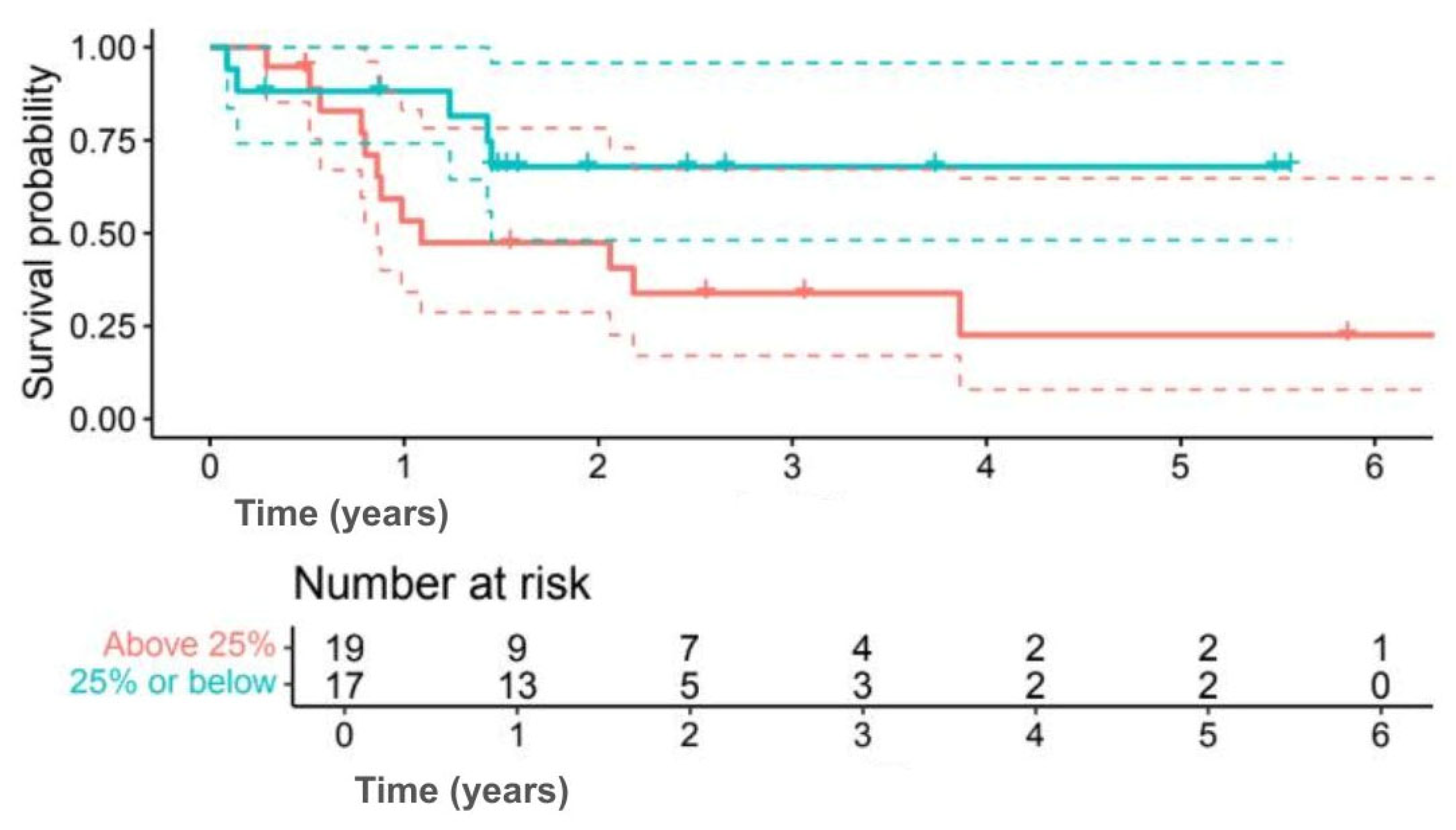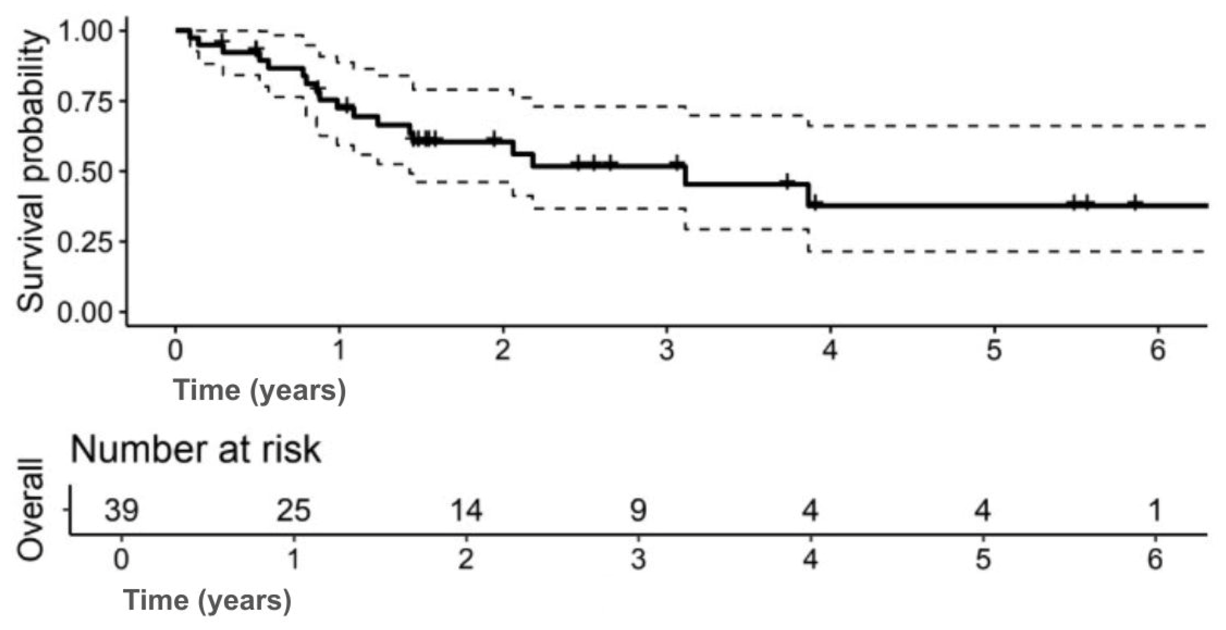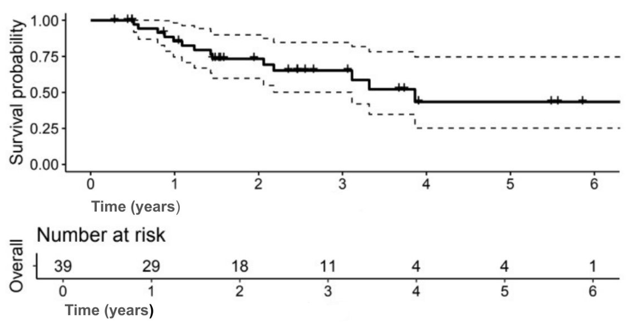 The median OS was 3.9 years (95% CI: 3.1–NA); 5-year OS: 43.4% (95% CI: 25.3–74.6) (Figure 1). The 5-year DFS was 37.7% (95% CI: 21.5–66.2) (Figure 2).