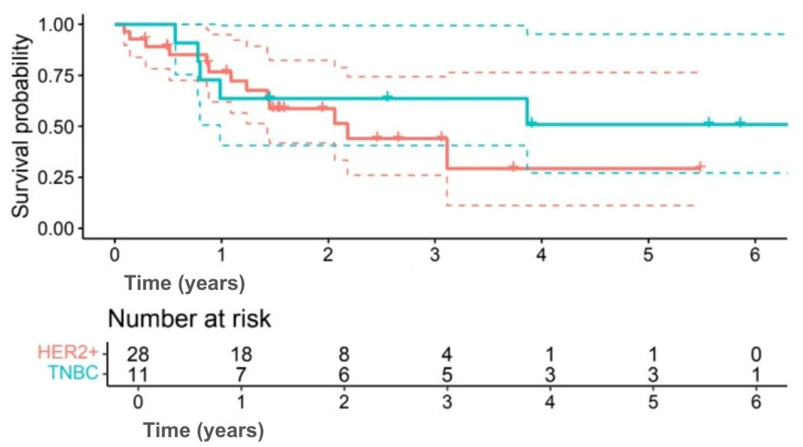 Notably, TNBC patients in our series did not show worse outcomes than HER2+ cases, though this must be interpreted with caution given the very small numbers and curve crossing in survival analyses.