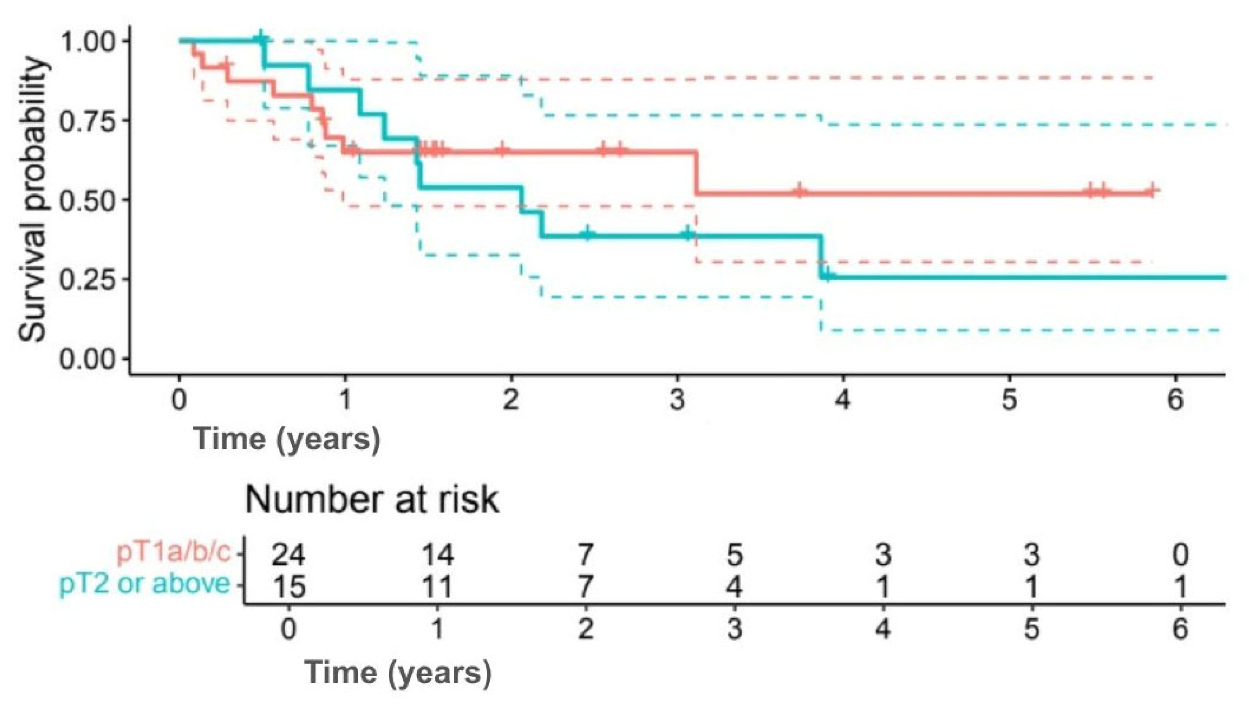 Tumor size showed similar results, with 5-year OS of 58.1% for tumors ≤ pT1c compared with 30.8% for tumors ≥ pT2 (p = 0.118) (Figure 5), and DFS of 51.9% versus 25.6% (p = 0.133) (Figure 6).