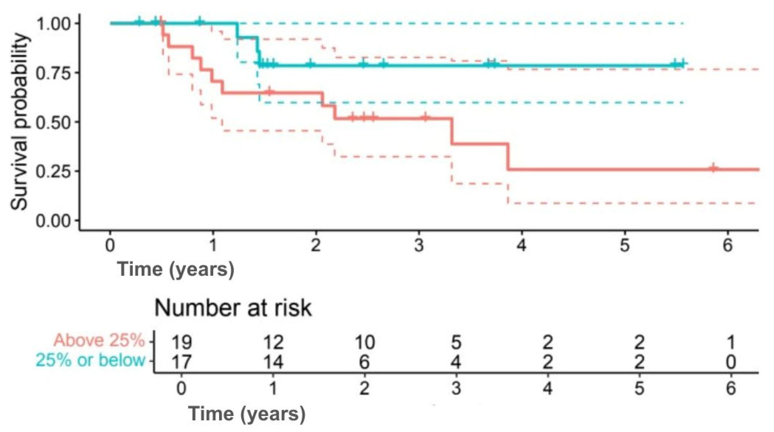 Figure 2. Kaplan–Meier curve showing disease-free survival (DFS) for the study cohort. (Solid lines indicate survival probability, and dashed lines indicate 95% CI. Tick marks represent censored events. Numbers at risk are shown below the x-axis).