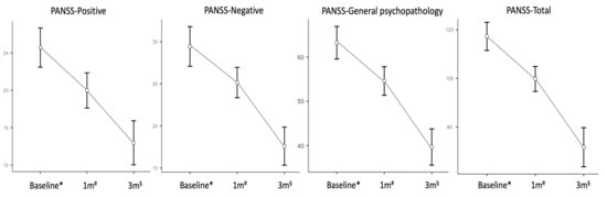 Changes in mean Positive and Negative Syndrome Scale scores with standard errors at different timepoints (ANOVA). Abbreviations: 1 m, one month follow-up; 3 m, three months follow-up; ANOVA, Repeated Measures Analysis of Variance; PANSS, Positive and Negative Syndrome Scale; sample size at * baseline n = 50, # one month n = 50, § endpoint n = 40.