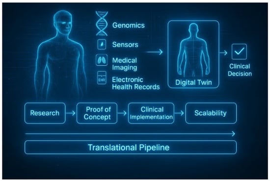 DTs create a direct link between the complexity of biomedicine and its clinical uses by combining various data sources, including wearable sensors, lab tests, medical imaging, artificial intelligence (AI) algorithms, and electronic health records. As a result, they are becoming increasingly recognized as one of the most promising technologies for achieving patient-centered, data-driven, and truly personalized care [,,,]. Figure 1 illustrates this process of integration, showing how multiple biomedical inputs converge into a DT to support real-time clinical decisions and outlining the translational pipeline toward clinical scalability.