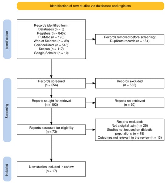 This PRISMA flow diagram (Figure 1) illustrates a methodologically rigorous and transparent study selection process for a systematic review. The procedure began with an identification phase where a broad search across five databases yielded 840 records, which were narrowed down to 656 unique articles after the removal of 184 duplicates. During the screening phase, a substantial number of records, 553, were excluded based on their title and abstract, after which 103 reports were sought for full-text review. Of these, 30 reports could not be retrieved for a final eligibility assessment. The primary reasons for non-retrieval were institutional paywall restrictions for certain journals and, in a smaller number of cases, broken or defunct repository links for older conference proceedings. The remaining 73 articles underwent a detailed eligibility assessment, leading to the exclusion of 56 for clearly specified reasons: 25 were not about a digital twin, 18 did not focus on diabetic populations, and 13 had irrelevant outcomes. This meticulous process resulted in a final set of 17 studies included in the review. The strength of this methodology is significantly enhanced by the reported inter-rater reliability, with Cohen’s Kappa coefficients of 0.76 for abstract screening and 0.95 for full-text assessment, indicating substantial to almost perfect agreement. Overall, the diagram and associated data demonstrate a robust, reproducible, and high-quality selection process that minimizes bias and adheres to established scientific standards.