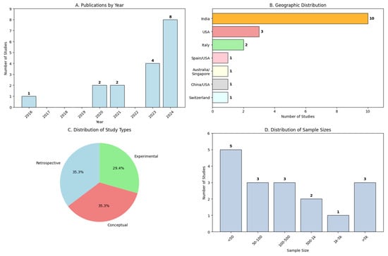From a methodological perspective, studies are classified into three main categories (Figure 2C): retrospective studies representing 35.3% (6 studies), conceptual/theoretical studies also with 35.3% (6 studies), and experimental/prospective studies with 29.4% (5 studies). This balanced distribution indicates growing maturity in the field, with a balance between conceptual development, retrospective validation, and prospective experimentation.