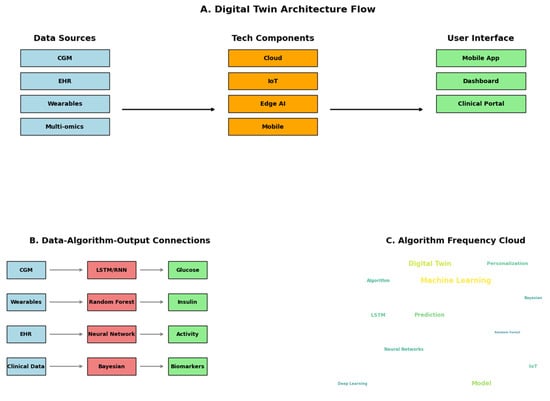 Technological architecture and algorithmic models in digital twin implementation. (A) Displays a flowchart of the general architecture of digital twins in diabetes, showing the progression from data sources (e.g., CGM, EHR, wearables, multi-omics) to technological components (e.g., cloud, IoT, Edge AI), and finally to user-facing interfaces such as mobile apps and clinical dashboards. (B) Illustrates typical data–algorithm–output connections, mapping data types to machine learning models (e.g., LSTM, Random Forest, Bayesian) and their respective outputs (e.g., glucose, insulin, biomarkers). (C) Presents a word cloud of frequently used algorithms and terms in the analyzed literature, where word size reflects relative frequency. Abbreviations: CGM = continuous glucose monitoring; EHR = electronic health record; IoT = Internet of Things; AI = Artificial Intelligence; LSTM = Long Short-Term Memory; RNN = Recurrent Neural Network. Note: This figure was generated using Python.