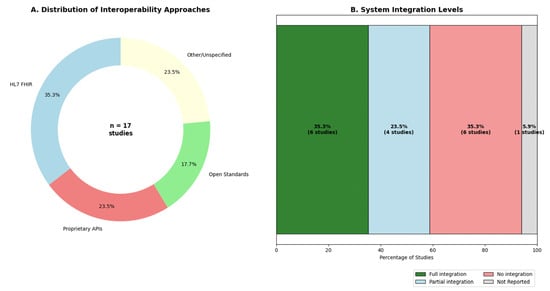 Interoperability landscape of diabetes digital twin systems. (A) The donut chart shows the distribution of interoperability approaches used in digital twin systems, with 35.3% adopting HL7 FHIR, 17.7% using other open standards, 23.5% relying on proprietary APIs, and 23.5% using other or unspecified methods. (B) The stacked bar chart presents the reported levels of system integration, revealing that 35.3% of studies achieved full integration, 23.5% had partial integration, 35.3% reported no integration, and 5.9% did not report integration status. Note: This figure was generated using Python.