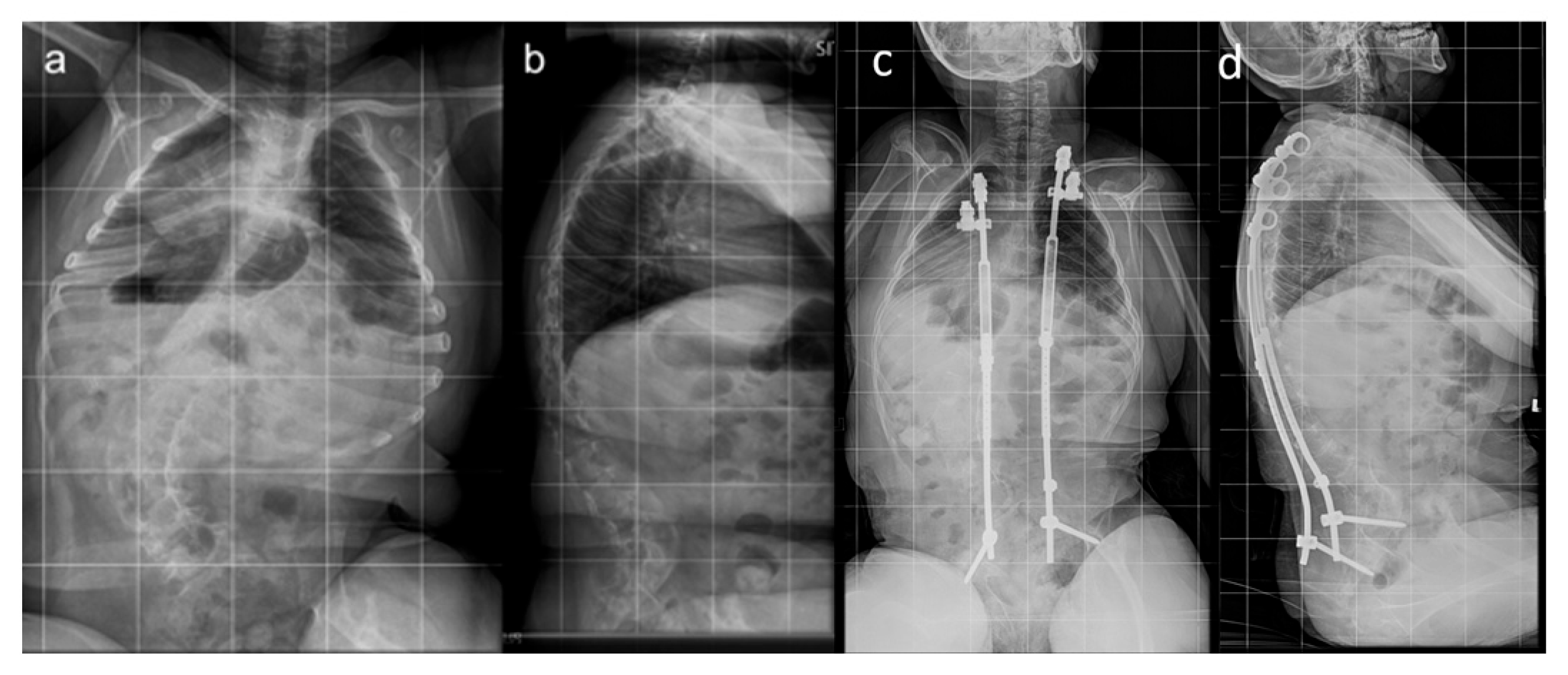 - Dede, O.; Motoyama, E.K.; Yang, C.I.; Mutich, R.L.; Walczak, S.A.; Bowles, A.J.; Deeney, V.F. Pulmonary and Radiographic Outcomes of VEPTR (Vertical Expandable Prosthetic Titanium Rib) Treatment in Early-Onset Scoliosis. J. Bone Jt. Surg. Am. 2014, 96, 1295–1302. [Google Scholar] [CrossRef] [PubMed]