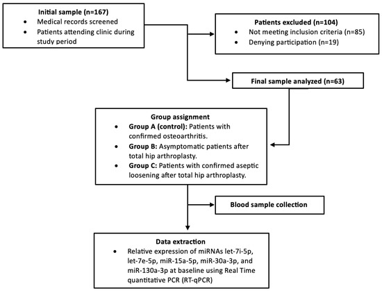 The primary aim of our study was to investigate the relative expression of five inflammation-related miRNAs—let-7i-5p, let-7e-5p, miR-15a-5p, miR-30a-3p, and miR-130a-3p—in patients with AL following primary THA, and to compare these profiles with control patients with degenerative osteoarthritis and asymptomatic THA recipients. A thorough review of recent literature confirmed the involvement of these miRNAs in inflammatory processes contributing to PPOL.