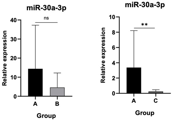 Relative expression of miR-30a-3p. Significant downregulation in Group C compared to controls (p < 0.001). ns: not significant, (**): statistically significant, p < 0.001