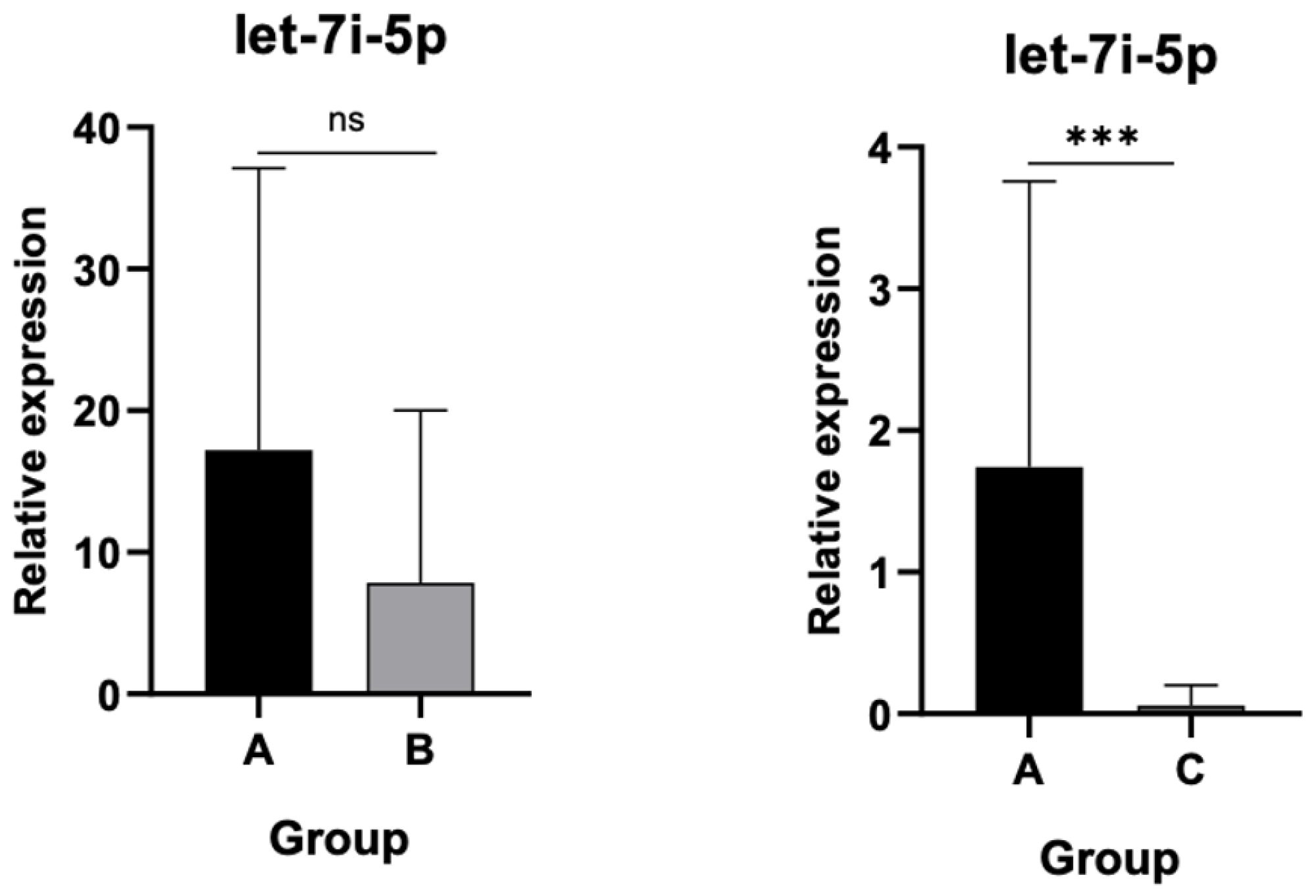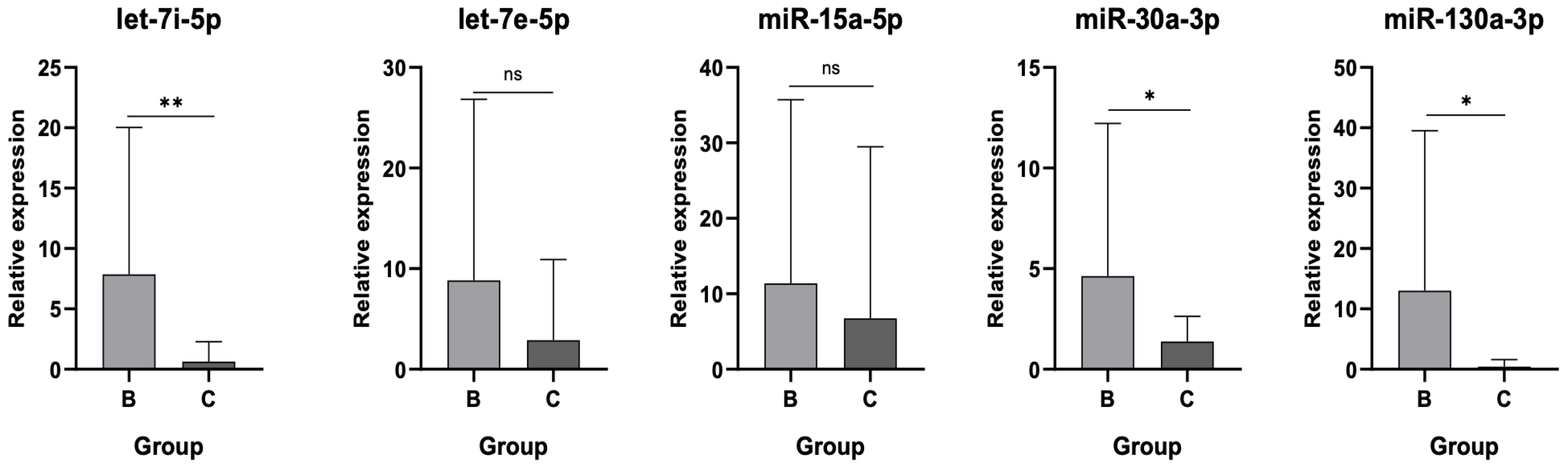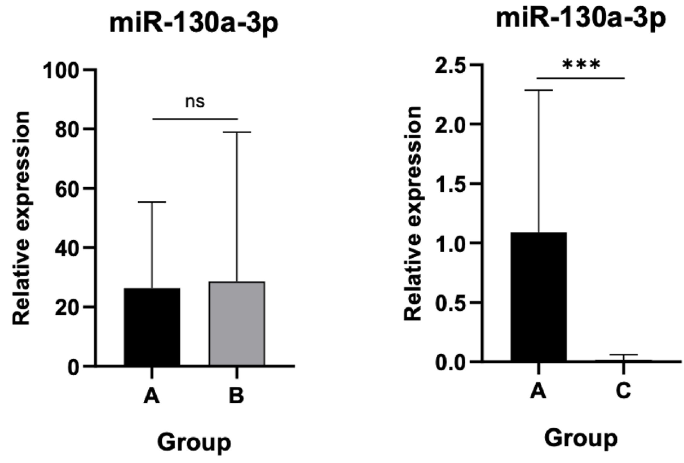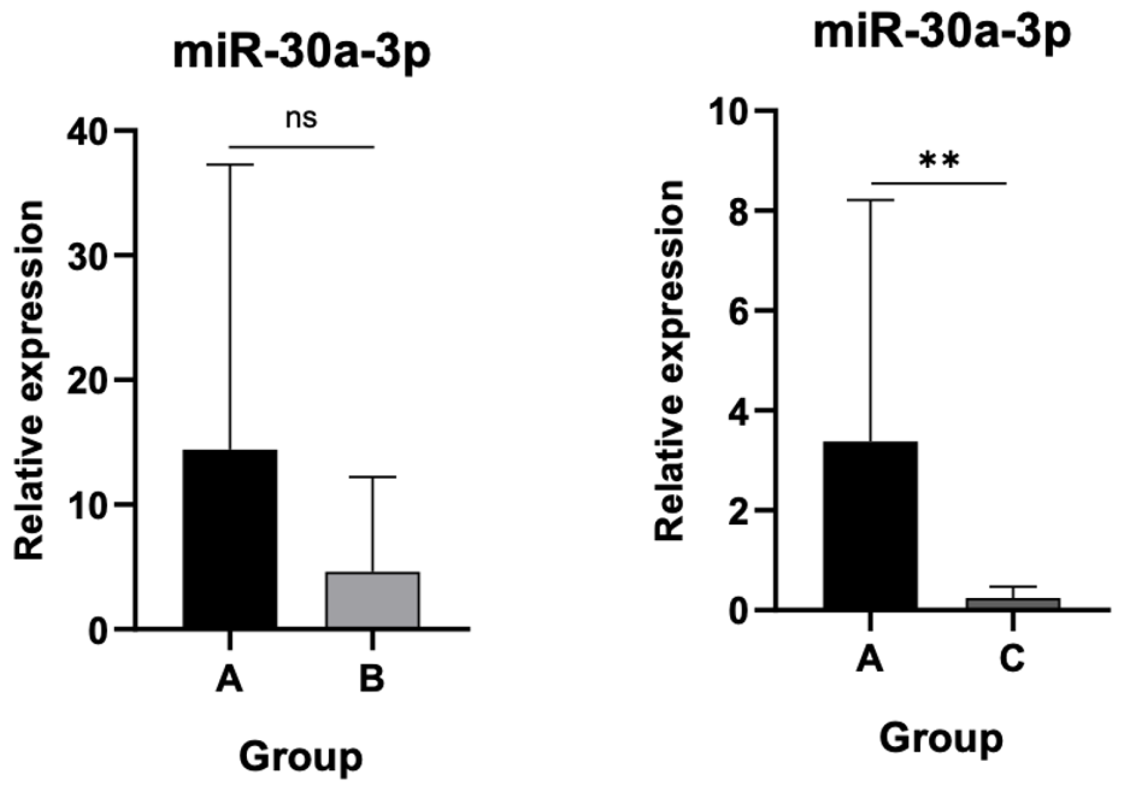 3.3. Differential Expression Levels of miR-30a-3p and miR-130a-3p Among Cohort Groups