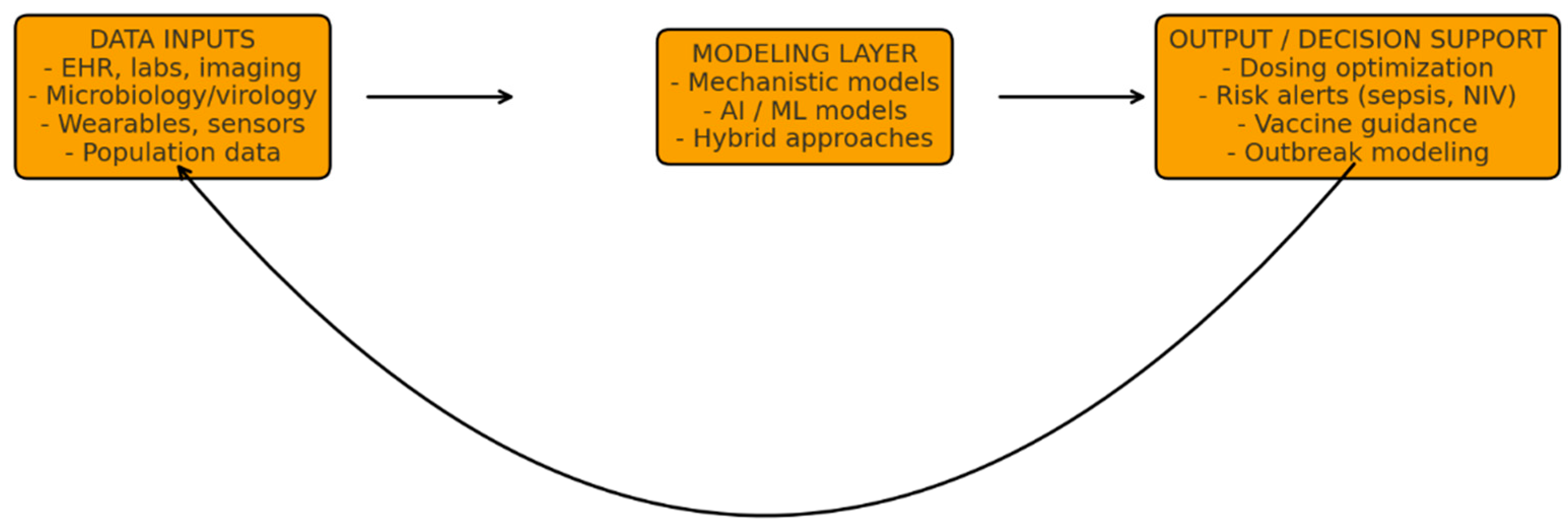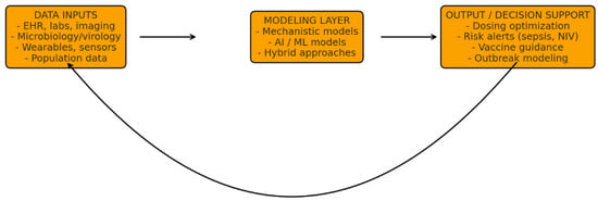 Multimodal patient and population data—such as electronic health records (EHRs), laboratory and microbiology results, imaging, wearable sensors, and epidemiological inputs—are integrated within mechanistic, machine-learning, or hybrid models to generate predictions and decision support for diagnosis, treatment optimization, and outbreak preparedness. A continuous feedback loop enables real-time model recalibration as new clinical information becomes available, supporting adaptive and personalized management.