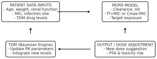One of the most consistent findings across the literature is that DTs can transform patient-level AMS by tailoring drug exposure to the unique developmental physiology of children. Traditional dosing regimens in pediatrics are often extrapolated from adult data or rely on weight-based formulas that fail to capture interpatient variability in drug clearance, maturation of organ systems, or dynamic pathophysiological changes during infection [4,8]. DTs overcome these limitations by combining mechanistic PK/PD models with data-driven learning modules that are continuously updated with laboratory values, vital signs, and TDM results [2,4]. An example of a DT applied to AMS, integrating PK/PD modeling and Bayesian TDM, is shown in Figure 2.