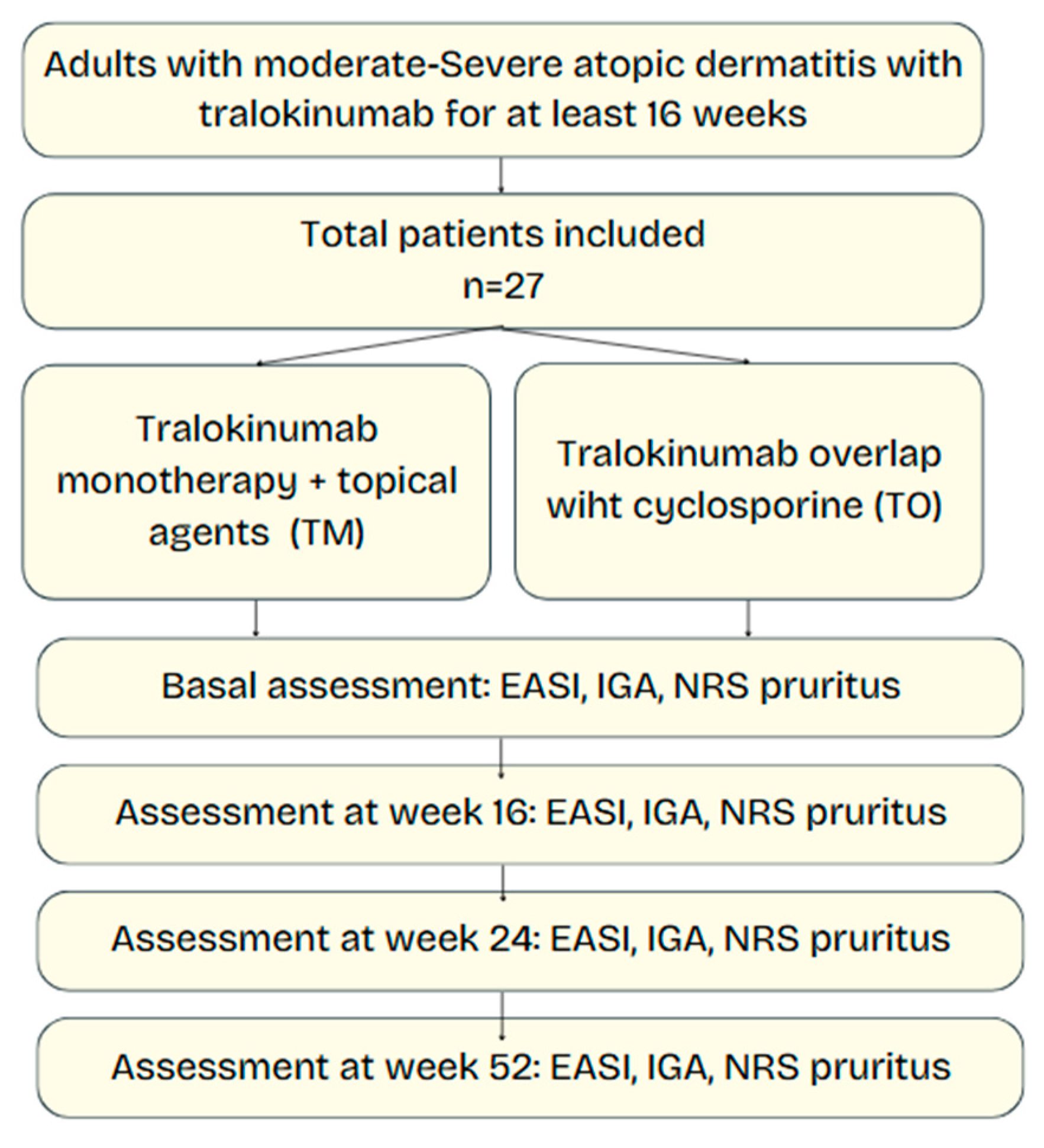 Tralokinumab with CSA overlap (TO)—the same tralokinumab regimen plus continuation of oral cyclosporine (2.5–5 mg/kg/day in two divided doses) for a maximum of 12 weeks post-tralokinumab initiation, after which CSA was discontinued. In this strategy, CSA was initiated de novo concurrently with tralokinumab at the index visit and used as a short bridging therapy with a predefined taper of up to 12 weeks. All patients had creatinine and blood pressure checked at weeks 16, 24, and 52 according to consensus guidelines.