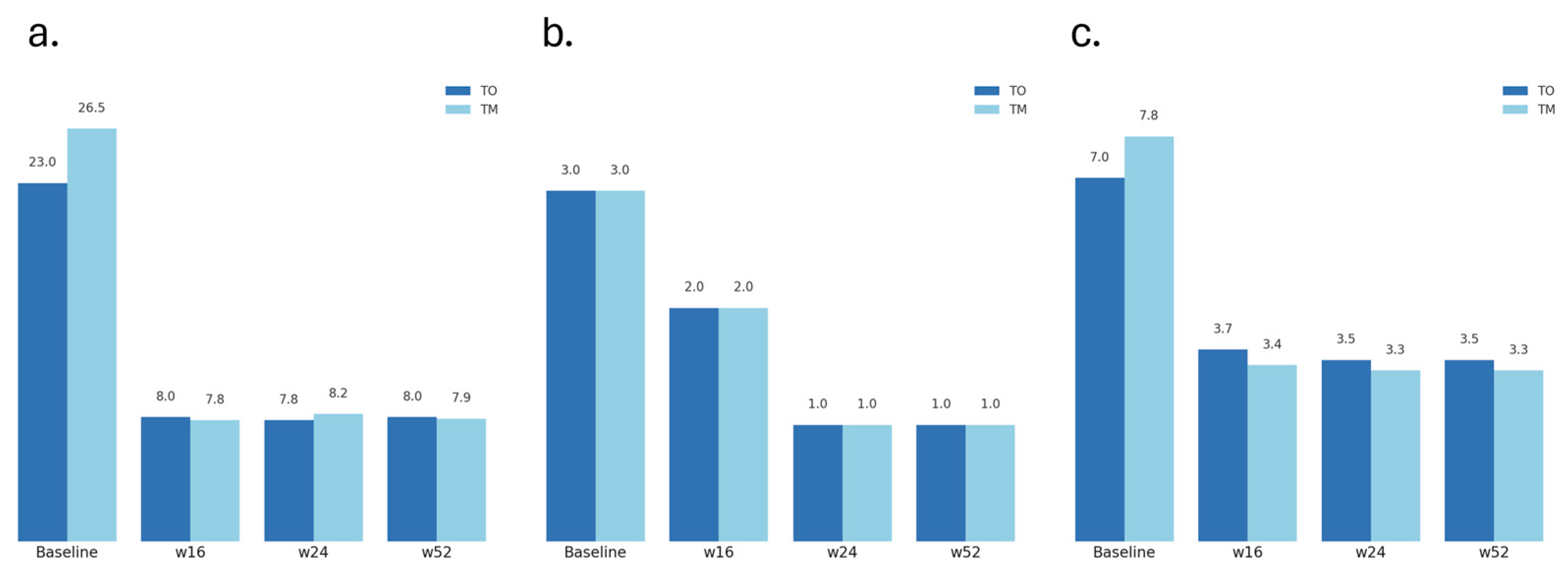 The primary endpoint was the mean change in EASI from baseline to week 52 between TM and TO groups. Secondary endpoints included changes in IGA and pruritus NRS, as well as rates and reasons for tralokinumab discontinuation.