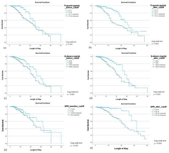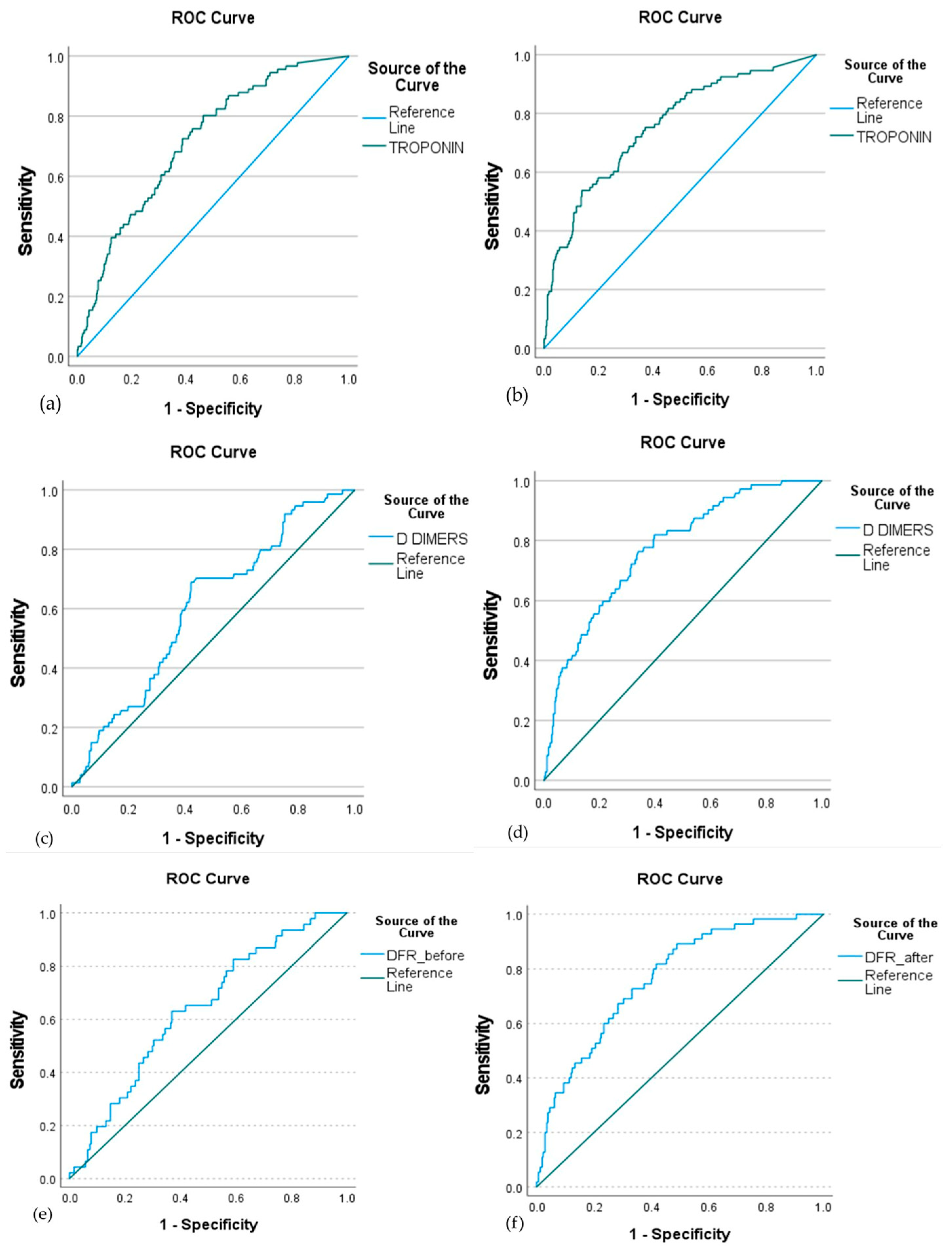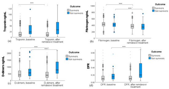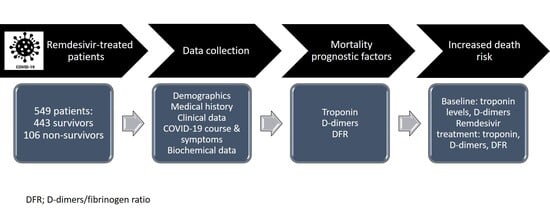 23]. We herein examine the prognostic significance of troponin, D-dimers, fibrinogen, and DFR for COVID-19 mortality, both independently and in association with remdesivir treatment. Specifically, in the present study, we have assessed (a) the predictive value for mortality of baseline (upon admission to hospital and prior to remdesivir treatment) troponin, fibrinogen, D-dimers, and DFR in COVID-19 hospitalized patients, (b) their impact on remdesivir treatment, and (c) whether remdesivir administration alters troponin, fibrinogen, D-dimers, and DFR levels, thus, impacting mortality.