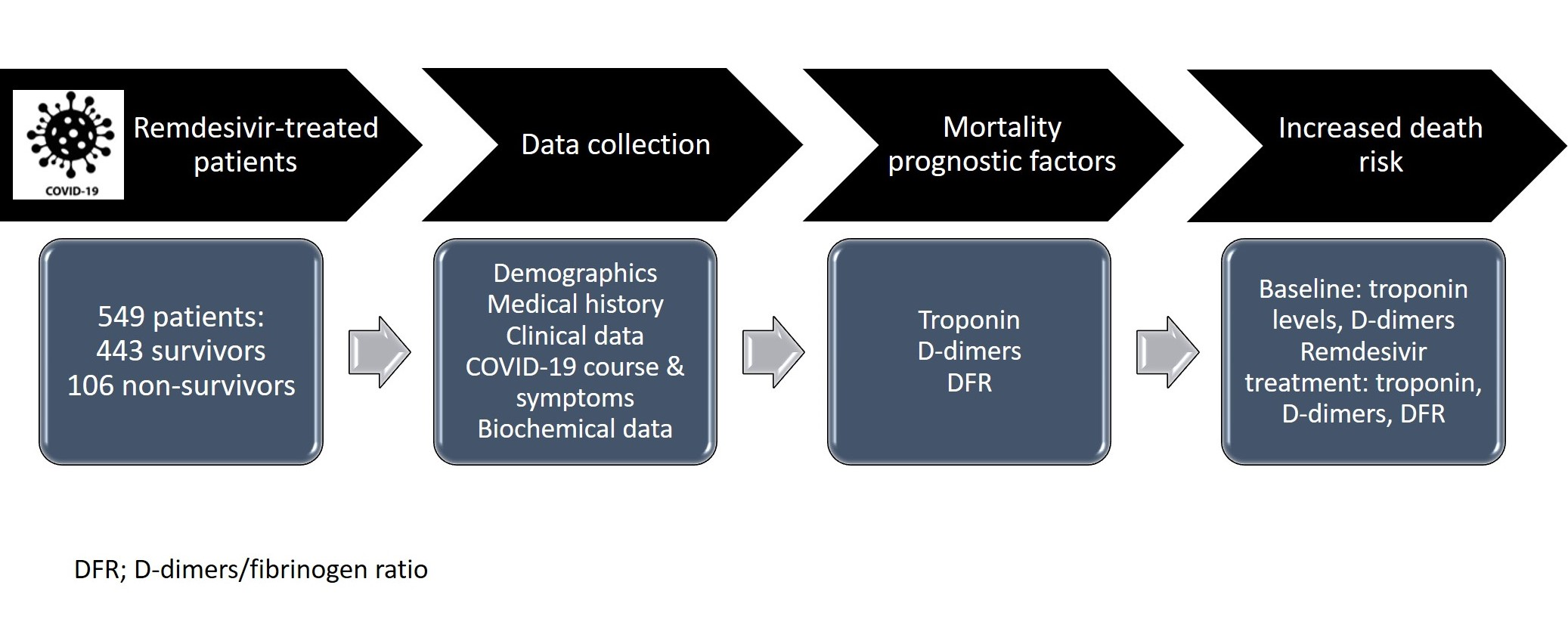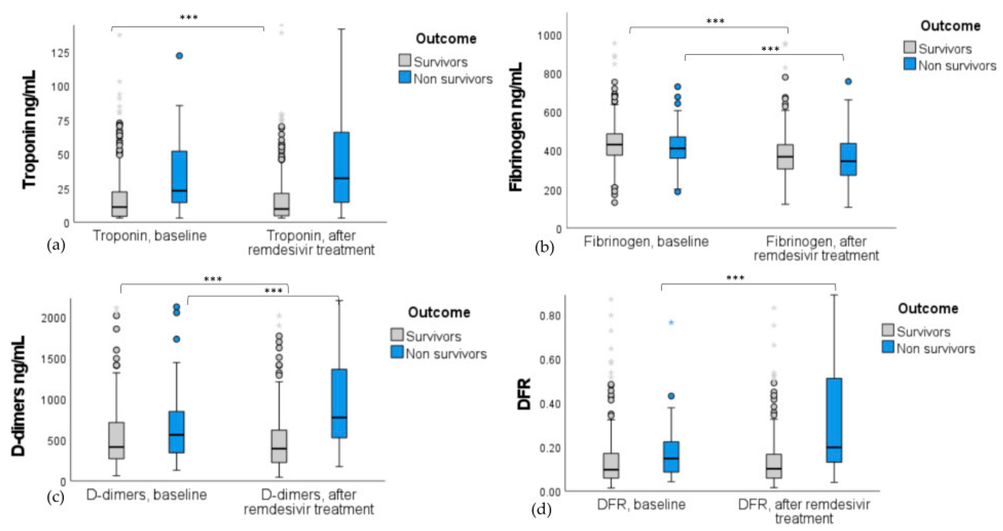 The potential prognostic value, however, of troponin, fibrinogen, D-dimers, and DFR in the COVID-19 course in remdesivir-treated patients is scarcely studied. Currently, only two studies have investigated the potential association of D-dimers with COVID-19 mortality in remdesivir-treated patients [