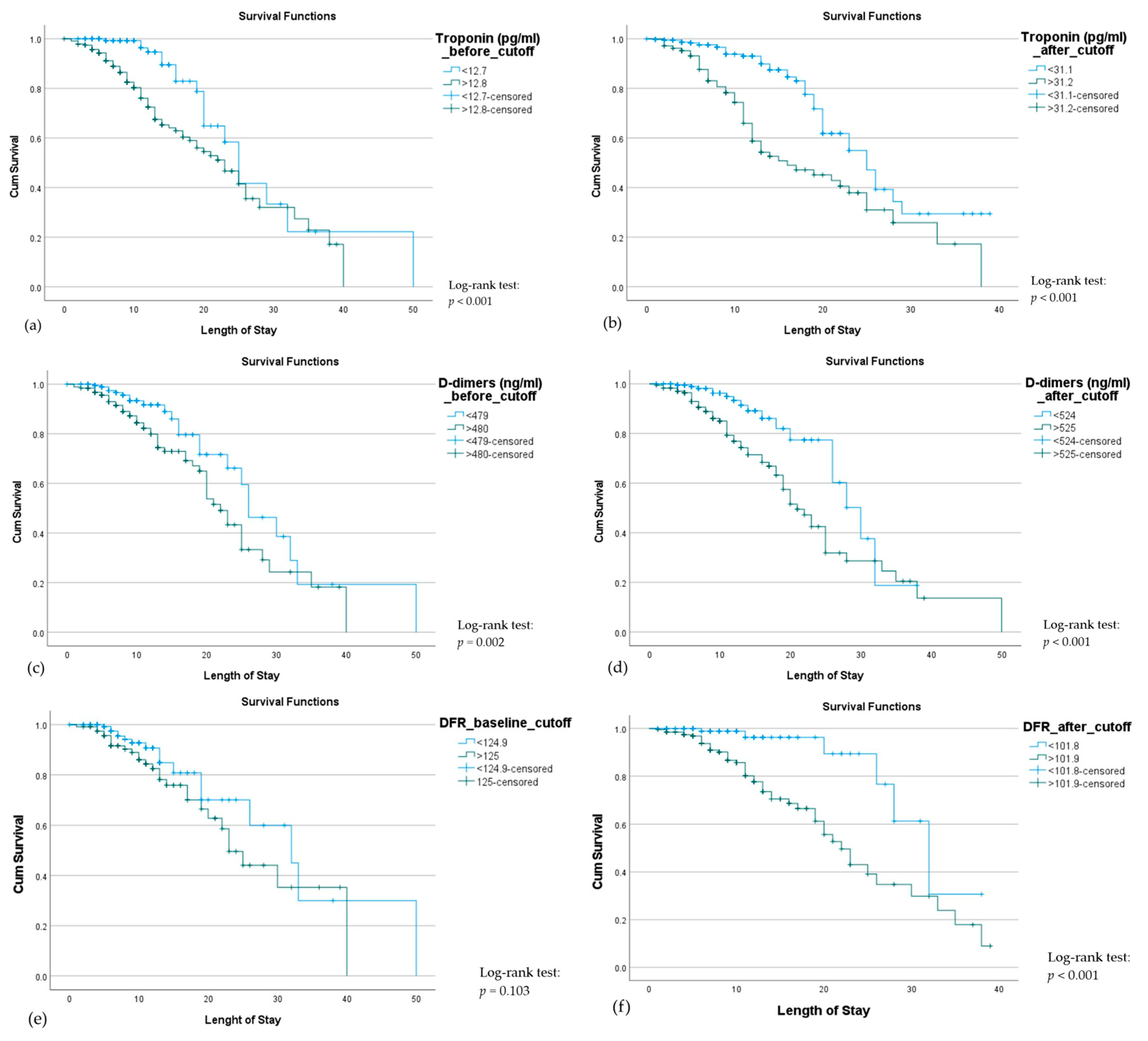 Our study has several strengths. The study hospital served as the reference remdesivir treatment hospital in the Rodopi region for COVID-19. Therefore, patient population entirely consists of COVID-19 patients, hospitalized from November 2020 to December 2022, who received remdesivir. To the best of our knowledge, this is the first study that evaluated the effect of troponin and coagulation markers on COVID-19 mortality, both at admission, and after remdesivir treatment. Therefore, our results describe the baseline prognostic value of these biomarkers, and, additionally, their change over remdesivir treatment. We should also acknowledge that unavoidable limitations exist in the study design. Due to the non-uniform ordering of biochemical analyses in real clinical settings, for several patients, data is missing at both timepoints (baseline and after treatment). As a retrospective observational study conducted in a single institution, there is inherent risk of selection bias and limited generalizability to other regions or healthcare settings. A comparable group of patients who did not receive remdesivir or received alternative therapy could not be included in the study. Other factors such as corticosteroid use, tocilizumab administration, vaccination status details, and antiviral timing relative to symptom onset were not included in the models. Finally, details on the severity of COVID-19 were not provided.
