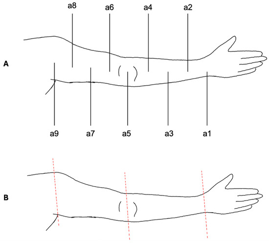 Measurements followed the same protocol as for the lower limbs. To differentiate between measurement points, the nomenclature was established as follows: a1, a2, …, a9. Similarly to the lower limb, point a9 was used only for alignment and was not included in the actual measurements.