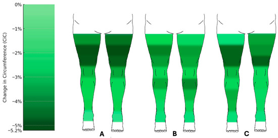 Changes in circumference of the lower limbs following liposuction. Heat map representation of mean percentage change in circumference (CiC) across measurement points after (A) the first (n = 60), (B) the second (n = 43), and (C) the third (n = 24) liposuction procedures. Reductions were most pronounced at proximal thigh levels (up to −5.2%), whereas distal measurement points showed little or no change. Median change in circumference relative to preoperative baseline (%) with 95% confidence intervals. Comprehensive CI tables for all measurement points are provided in the Supplementary Data (Figures S1–S3).