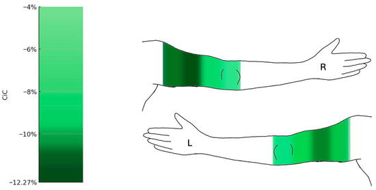 Changes in circumference of the upper limbs following liposuction (n = 19). Heat map representation of mean percentage change in circumference (CiC) of the upper extremities. Significant reductions were observed in the proximal upper arm segments (up to −12.27%), while the forearm and wrist (a1–a4) remained largely unchanged. Median change in circumference relative to preoperative baseline (%) with 95% confidence intervals. Comprehensive CI tables for all measurement points are provided in the Supplementary Data (Figure S4). L = left arm; R = right arm.