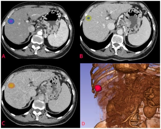 Example of segmentation of an HCC nodule in arterial phase at the S7-S8 junction. (A) nodule on transverse plane in arterial phase with corresponding 5 mm margin delineation; (B) segmentation of the same nodule in venous phase; (C) segmentation of the HCC nodule in delayed phase; (D) 3D reconstruction of the arterial phase and the segmented nodule.