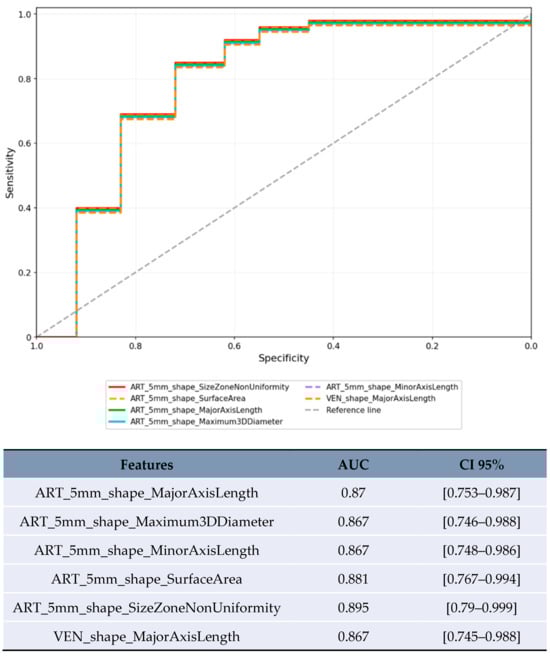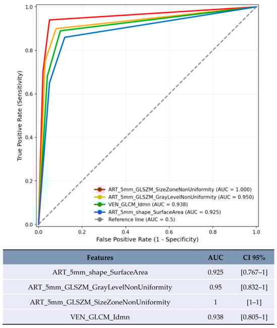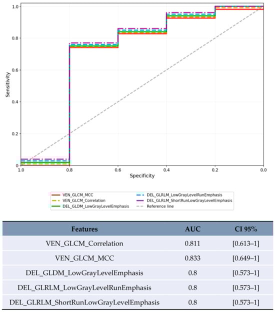 In the limited subset of LR-3/4 lesions (n = 20), delayed phase features showed promising preliminary results (Figure 5): GLDM_LowGrayLevelEmphasis achieved AUC 0.8 [95% CI 0.573–1.0] and GLRLM_ShortRunLowGrayLevelEmphasis achieved AUC 0.8 [95% CI 0.573–1.0].