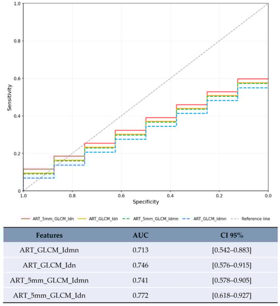 For lesions <20 mm in arterial phase with 5 mm margin, several features showed artificially inflated performance metrics that are not clinically meaningful (Figure 2). These results are presented solely for completeness but should not be considered valid findings and are excluded from the conclusions. For lesions 20–50 mm in arterial phase, the most reliable results were obtained with texture homogeneity features (Figure 3): ART_5mm_GLCM_Idn achieved AUC 0.772 [95% CI 0.618–0.927] and ART_5mm_GLCM_Idmn achieved AUC 0.741 [95% CI 0.578–0.905]. The comparison between original and expanded margin features is shown in Table 4.