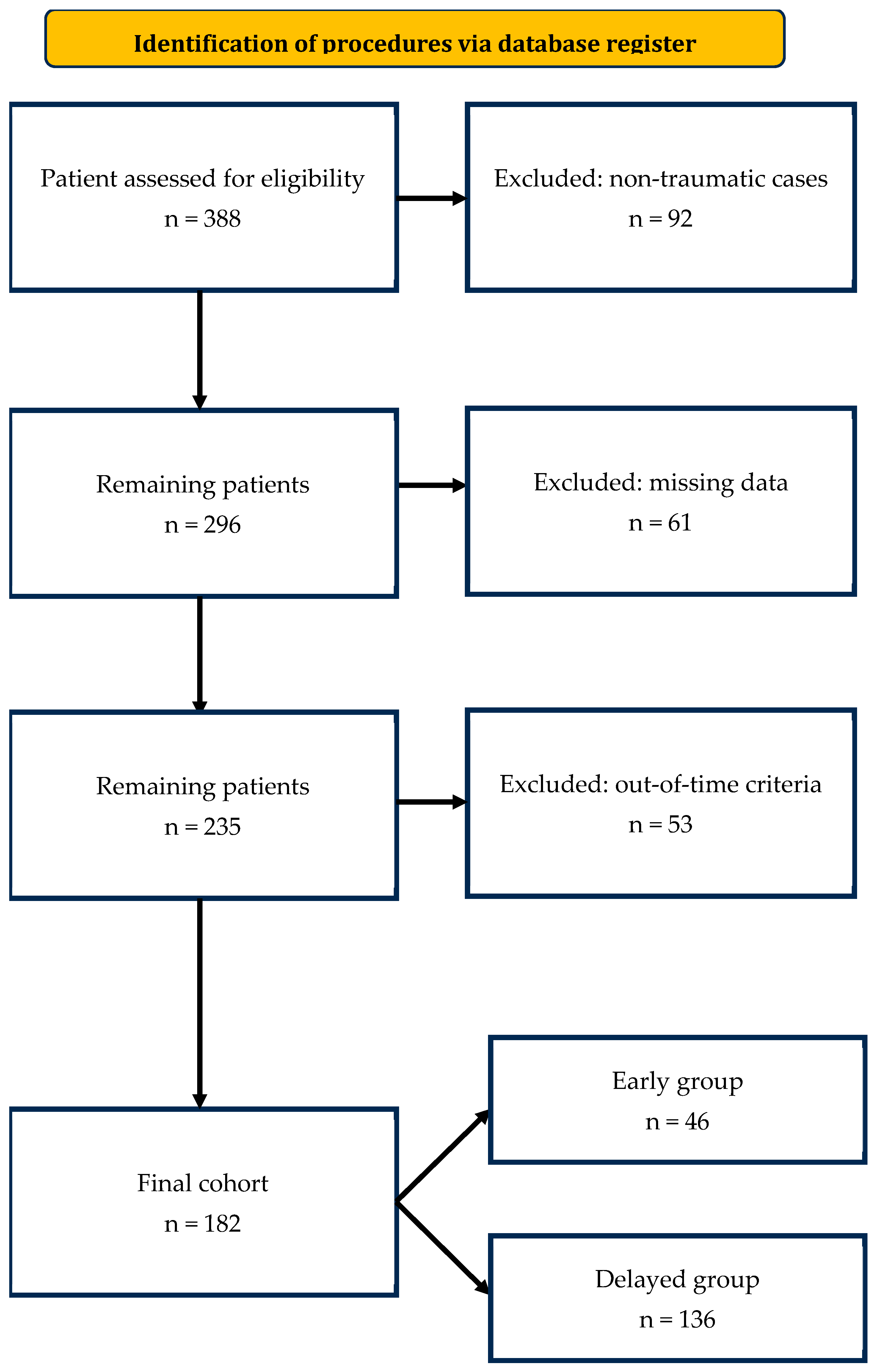 | Procedure | Early (n = 46) | Delayed (n = 136) |
