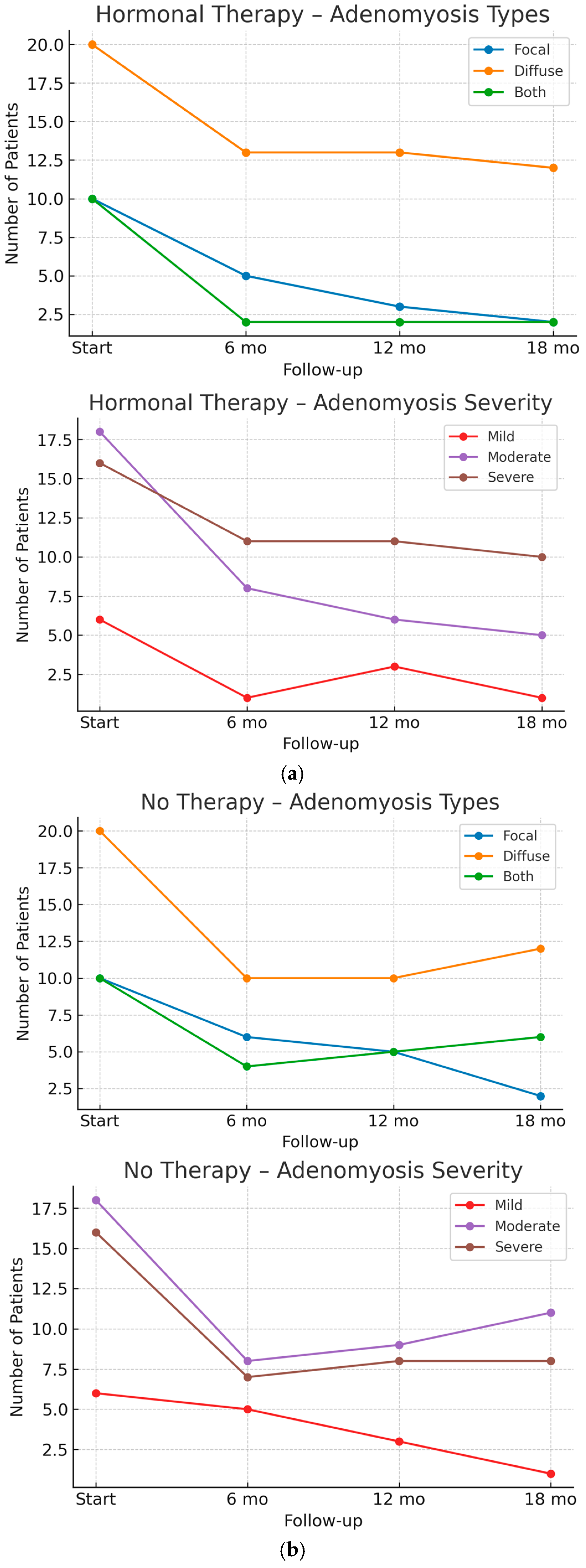 - Borghese, G.; Doglioli, M.; Orsini, B.; Raffone, A.; Neola, D.; Travaglino, A.; Rovero, G.; Del Forno, S.; de Meis, L.; Locci, M.; et al. Progression of adenomyosis: Rate and associated factors. Int. J. Gynaecol. Obstet. 2024, 167, 214–222. [Google Scholar] [CrossRef] [PubMed]