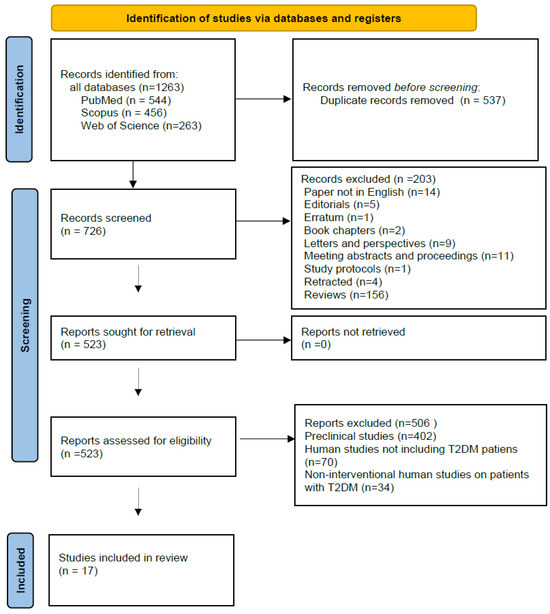 A total of 1263 articles were identified during the search through prespecified databases (PubMed, n = 544; Scopus, n = 456; Web of Science, n = 263). After removing duplicate manuscripts, 726 articles were screened. Articles written in languages other than English were excluded, as well as editorials, book chapters, errata and retracted articles, letters, perspectives, meeting abstracts and proceedings, study protocols, and reviews. After these exclusions, 523 studies on miRNA and various antidiabetic agents remained. Next, preclinical studies (n = 402), clinical studies not involving patients with type 2 diabetes (n = 70), and non-interventional clinical studies on patients with type 2 diabetes (n = 34) were excluded. No additional eligible studies were found in the gray literature search. Ultimately, 17 interventional studies on patients with type 2 diabetes investigating the effect of various antidiabetic drugs on miRNA were identified for full-text review. All these manuscripts were retrieved for detailed assessment. Figure 1 presents the flow diagram describing the study selection process.