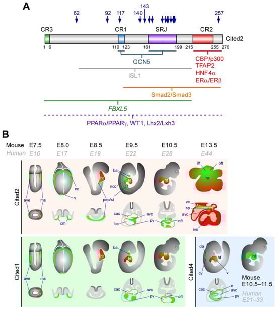 Despite the considerable overlap in expression among Cited1, Cited2, and Cited4 within cardiogenic regions during mouse embryogenesis, only embryos carrying a germline Cited2 knockout exhibit severe developmental impairments and die during gestation with a myriad of cardiac abnormalities and defective establishment of the left–right axis, which also contributes to correct heart formation [,,,,,,,,,,,,,,,,,].