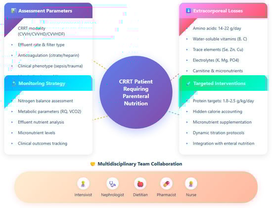 Nutrition is a cornerstone of supportive therapy in critically ill patients, as inadequate provision of energy, protein, electrolytes, vitamins, and trace elements may exacerbate catabolism, impair immune function, delay recovery, and worsen outcomes [,]. In the intensive care unit (ICU), enteral nutrition is generally preferred when feasible, but there remain subsets of patients in whom gastrointestinal intolerance or contraindications preclude adequate enteral feeding, making parenteral nutrition (PN) an essential alternative [,]. Among these, a particularly challenging group comprises patients with acute kidney injury (AKI) undergoing continuous renal replacement therapy (CRRT). CRRT is commonly employed in hemodynamically unstable critically ill patients and is associated with significant perturbations of fluid balance, solute clearance, and metabolic substrate handling [,]. The extracorporeal circuit and continuous modality of CRRT introduce unique metabolic interactions—particularly losses of amino acids, water-soluble vitamins, electrolytes, and glucose into the effluent—that can lead to underestimation of true nutritional needs if not carefully accounted for [,]. Moreover, the use of citrate anticoagulation or glucose-free dialysate/replacement fluids may lead to “hidden” caloric loads or deficits, further complicating energy and substrate calculations [,]. Despite the biologic plausibility of these influences and the clinical urgency of optimizing nutrition in CRRT patients, evidence-based guidance is scarce and most recommendations remain reliant on extrapolations or expert consensus [,,]. The consequent risk is that patients may receive underfeeding, protein deficits, or unrecognized micronutrient depletion, all of which may adversely affect muscle preservation, immune competence, healing, and ultimately morbidity and mortality [,]. In this narrative expert review, we aim to articulate a personalized, physiology-informed framework for parenteral nutrition in critically ill patients undergoing CRRT, integrating available evidence, pathophysiologic principles, and practical considerations to support tailored nutritional therapy in the complex critical care environment.