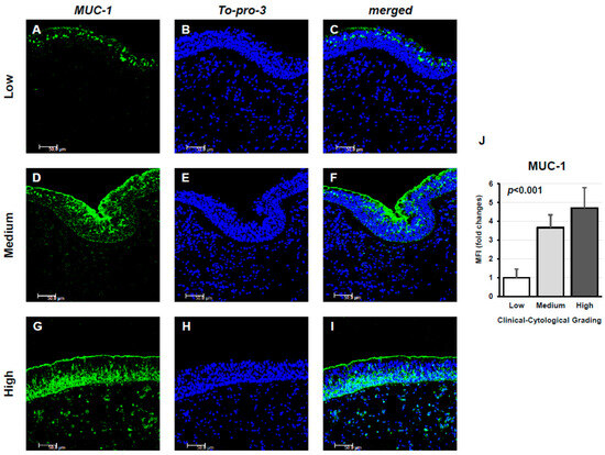 Immunofluorescence analysis of MUC1 expression in nasal tissue samples from CRSwNP patients stratified by Clinical–Cytological Grading (CCG). Panels (A–I) display MUC1 staining (green) in specimens with low (A–C), moderate (D–F), and high (G–I) CCG scores. Nuclear staining was achieved with To-Pro-3 (blue). Each panel represents one of six independent samples per severity group. Scale bar: 50 μm; magnification: 400×. Panel (J) illustrates the quantitative comparison of mean fluorescence intensity (MFI) for MUC1 among the three CCG categories, demonstrating a progressive increase in signal intensity with disease severity (ANOVA, p < 0.001).