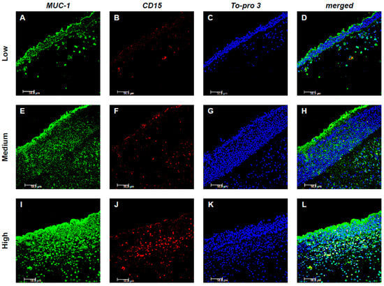 The expression of MUC-1 in both resident and inflammatory cells was subsequently analyzed. Notably, MUC-1 showed a significant colocalization with CD15+ eosinophils (Figure 2), whereas no colocalization was observed with Tryptase+ mast cells (Figure 3). In particular, in low-GCC patients, a limited expression of both MUC-1 and CD15 was shown. On the contrary, the expression of MUC-1 and CD15 significantly increased as medium and high CCG tissues were examined, respectively. Furthermore, when assessing inflammatory CD15+ cells expressing MUC-1, their number progressively increased across tissues with low, medium, and high CCG grades. Quantitative analysis of double-positive MUC-1+/CD15+ eosinophils confirmed this trend, showing a significant rise in their count in relation to CCG severity (p < 0.001), suggesting a potential synergistic interaction between the two markers, related to the progression and severity of the disease (Figure 2A–L).