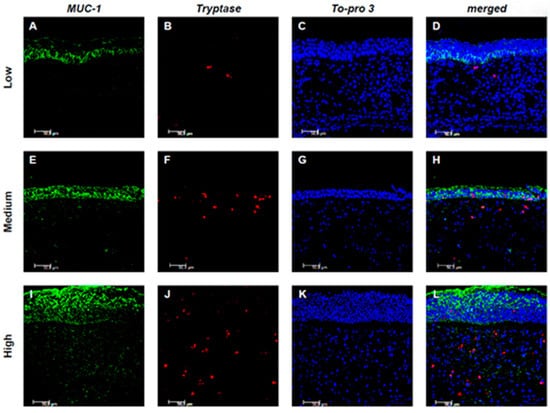 Evaluating the expression of MUC-1 and Tryptase, it was observed that in low CCG samples, the expression of both markers was limited or absent, with no significant co-localization between the two markers. In medium CCG samples, the expression of both markers increased, with limited co-localization. However, a statistically significant correlation between the expression of MUC-1 and Tryptase was found only in high CCG samples, although without colocalization, suggesting distinct but potentially related processes (Figure 3A–L).