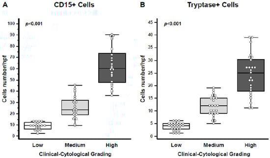 A detailed quantification of both CD15+ eosinophils and Tryptase+ mast cells revealed a progressive increase in their numbers in correlation with the CCG score (p < 0.001 for both eosinophils and mast cells; Figure 4A,B).