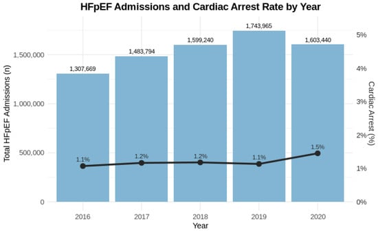 A total of 7,738,108 hospital admissions for HFpEF were identified from 2016 to 2020. Among these, 93,440 patients (1.2%) experienced CA in the hospital, while the remaining 7,644,668 (98.8%) did not. From 2016 to 2020, the number of HFpEF admissions increased annually, peaking in 2019, before declining slightly in 2020. The incidence of CA rose from 1.1% in 2016 to 1.5% in 2020 (Figure 1). In a sensitivity analysis excluding 2020 to account for potential pandemic-related effects, similar trends were observed, with the rate of in-hospital cardiac arrest increasing from 1.1% in 2016 to 1.4% in 2019 (compared with 1.5% in 2020 in the full cohort). This represents a relative increase of about 36% in CA incidence over the 5-year period.