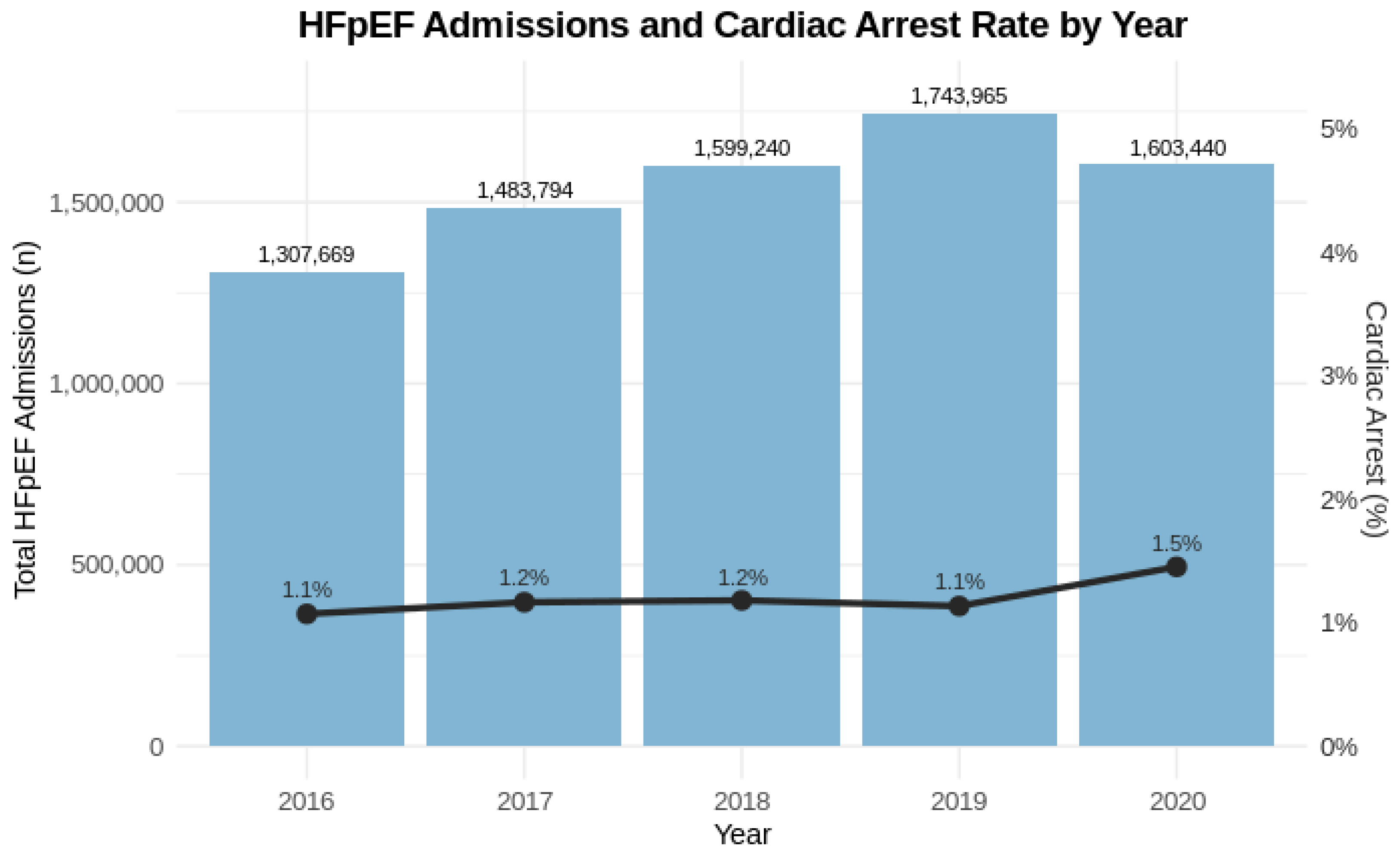 Mohammed AS, Takagi MA, Yasmeen U, Gandhi A, Khan AFS, Popat A, Desai R, Kambali S, Koshak AKA, Mandoorah S. Nationwide Trends in Demographics, Comorbidities, and Mortality Among Elderly Patients with Heart Failure with Preserved Ejection Fraction Hospitalized with Cardiac Arrest. Journal of Personalized Medicine. 2025; 15(11):559. https://doi.org/10.3390/jpm15110559