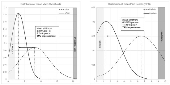 Figure 2 illustrates patient-level threshold changes. The population-level impact is shown through distribution curves: MMG thresholds shifted from a broad, right-skewed distribution centered at 8.2 mA to a narrower distribution centered at 3.2 mA (Figure 3 left), while pain scores shifted from 6.5 NPS pre-operatively to 1.4 NPS post-operatively (79% improvement, p < 0.001; Figure 3 right).