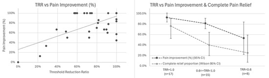 Threshold Reduction Ratio (TRR) correlates with pain outcomes. (Left) Scatter plot showing association between TRR and percentage pain improvement (r = 0.656, 95% CI 0.426–0.807, p < 0.001, n = 38). Trend line with 95% confidence interval shown. (Right) Stratified outcomes by TRR category showing mean percentage pain improvement (dark line with 95% CI) and proportion achieving complete pain relief (light line with Wilson 95% CI) for TRR = 1.0 (n = 17), 0.6 ≤ TRR < 1.0 (n = 15), and TRR < 0.6 (n = 8).