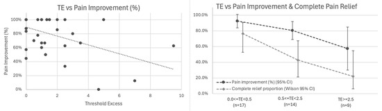 Threshold Excess (TE) inversely correlates with pain outcomes. (Left) Scatter plot showing inverse association between TE and percentage pain improvement (r = −0.500, 95% CI −0.702 to −0.223, p = 0.001, n = 40). Linear relationship: each 1 mA of TE associated with 6.3% less pain improvement. (Right) Stratified outcomes by TE category showing mean percentage pain improvement (dark line with 95% CI) and proportion achieving complete pain relief (light line with Wilson 95% CI) for 0.0 ≤ TE < 0.5 mA (n = 17), 0.5 ≤ TE < 2.5 mA (n = 14), and TE ≥ 2.5 mA (n = 9).
