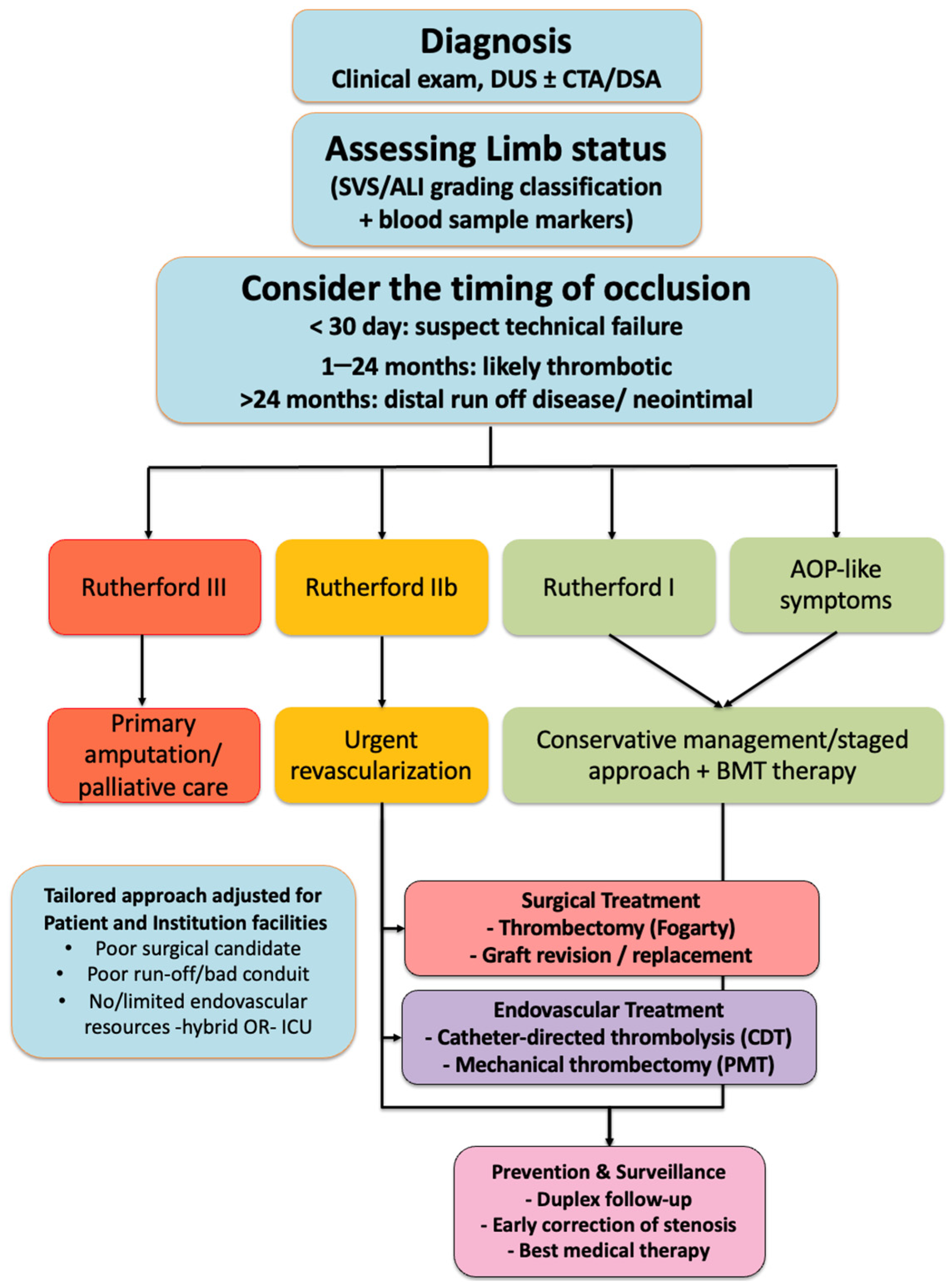 Given the lack of high-level evidence and the heterogeneity of available studies, therapeutic decisions in the acute setting must be individualized. In some patients, particularly those with minimal or no ischemic symptoms and well-compensated collateral circulation, a conservative approach may be appropriate. This is especially true in high-risk surgical candidates or in cases where the limb is not immediately threatened. However, such an approach requires careful monitoring, as the natural history of untreated graft thrombosis is associated with poor outcomes.