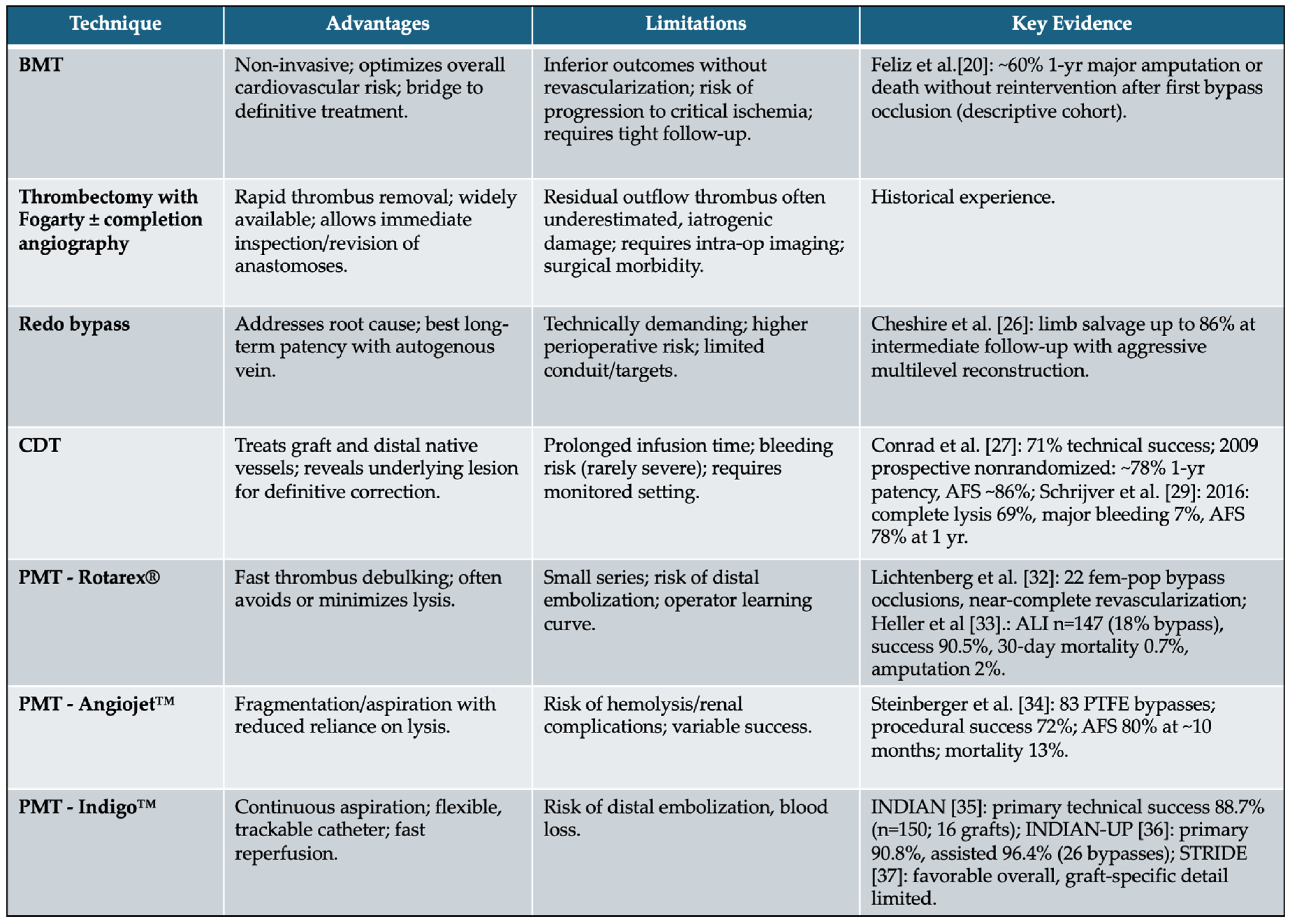 While surgical treatment was once the standard of care for acute bypass occlusion, it is now often reserved for specific clinical situations where endovascular options are contraindicated, unavailable, or have failed. Careful patient selection, intraoperative imaging, and hybrid approaches are key to maximising the success of surgical revascularization in this complex and high-risk population. The management of graft failure also depends on the timing of the occlusion. Early failure (within 30 days) is typically related to technical issues or hypercoagulable states and often requires surgical revision or thrombectomy. Intermediate failure (1 to 24 months) may be addressed with endovascular reintervention, mechanical thrombectomy, or redo bypass, depending on the anatomical and clinical context. Late failure (after 2 years) is often driven by neointimal hyperplasia or disease progression and can be managed with a combination of endovascular and surgical techniques, tailored to the patient’s anatomy and comorbidities.