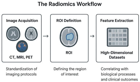 The radiomics workflow begins with the acquisition of medical images using modalities such as CT, MRI, or PET, where the standardization of imaging protocols is essential to ensure reproducibility and comparability across institutions [,,,]. Following acquisition, the region of interest (ROI) is defined, allowing quantitative descriptors to be extracted from the selected area [,]. These descriptors often include texture and intensity features that capture the ultrastructural architecture of tissues []. The extracted features are subsequently represented in high-dimensional datasets that can be correlated with underlying biological processes and clinical outcomes [,,], (Figure 1).