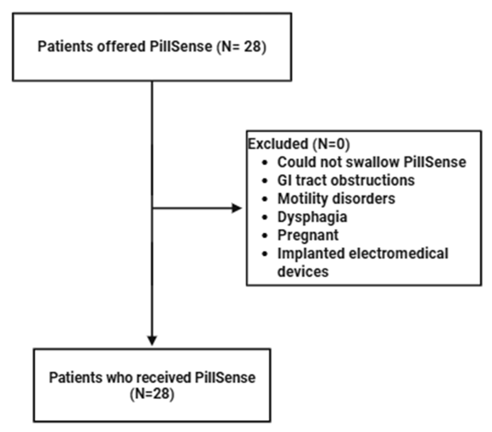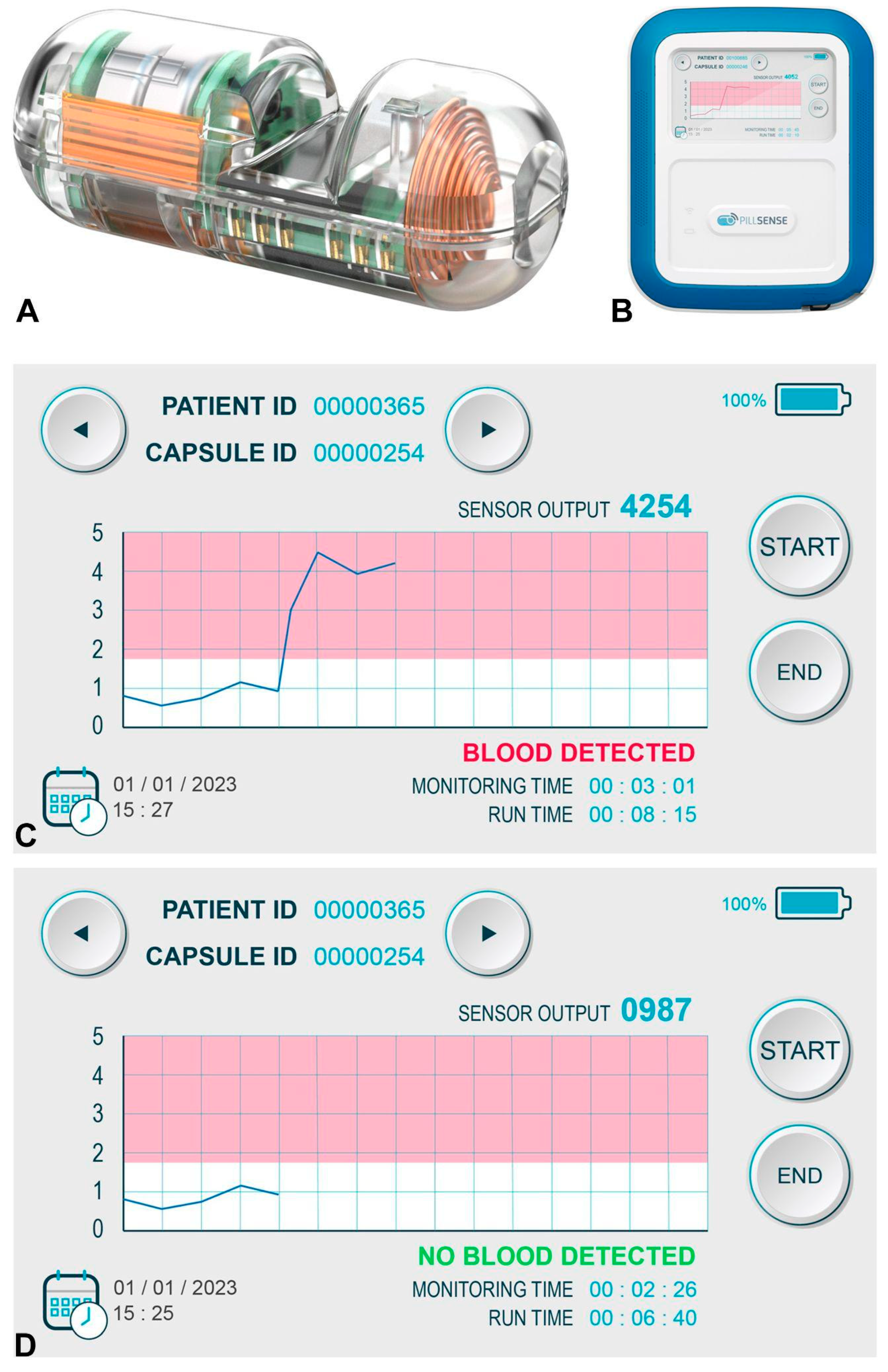 The PillSense system included an ingestible capsule and a receiver. The capsule detected the presence of blood by analyzing light absorption at various wavelengths. The receiver wirelessly received data from the capsule and displays a simple binary result: “Blood Detected” or “No Blood Detected”. The entire process took approximately 10 min and did not require sedation or endoscopic procedure or image interpretation expertise. The device was operated by residents or clinical fellows. No patients underwent repeat capsule testing (