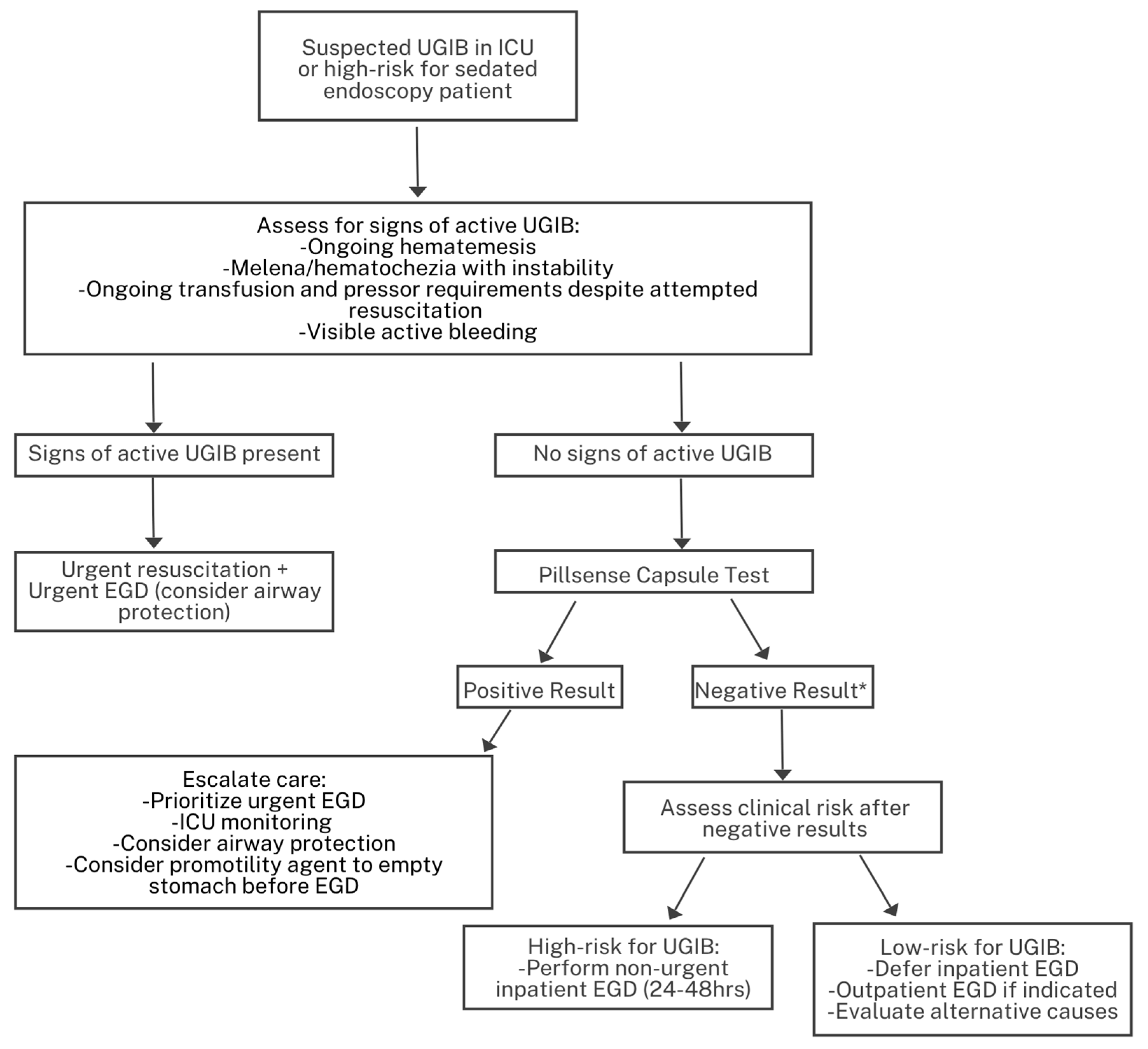 Figure 3) that integrates PillSense results with clinical assessment for patients at high risk for sedation-related complications. This algorithm provides a structured approach for escalation or de-escalation of care: positive results support urgent endoscopy, airway protection, and consideration of promotility agents, while negative results allow for safe deferral or outpatient management depending on residual clinical risk. In patients with negative PillSense results but ongoing clinical concern, management should emphasize close monitoring and reassessment rather than immediate reassurance. Persistently unstable hemodynamics, declining hemoglobin, or continued hematemesis or melena should prompt early endoscopy or repeat diagnostic evaluation. By combining real-time evidence of bleeding with bedside assessment, this framework aims to reduce unnecessary urgent endoscopies while ensuring timely intervention for those most likely to benefit. While this algorithm reflects our real-world experience, it needs further prospective validation in larger multicenter cohorts before implementation.